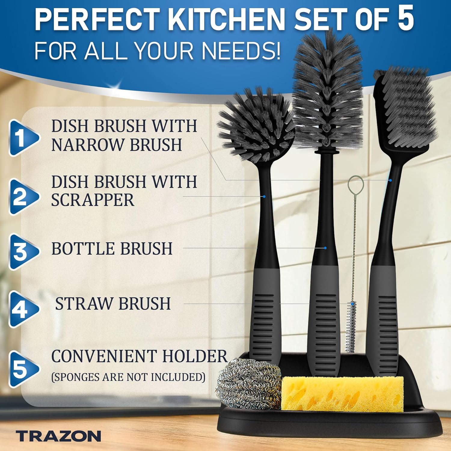 - Kitchen dish drush set of 5 pieces - includes a dish brush with handle, dish scrub brush, bottle scrubber brush, straw brush, and a holder for convenient brush storage