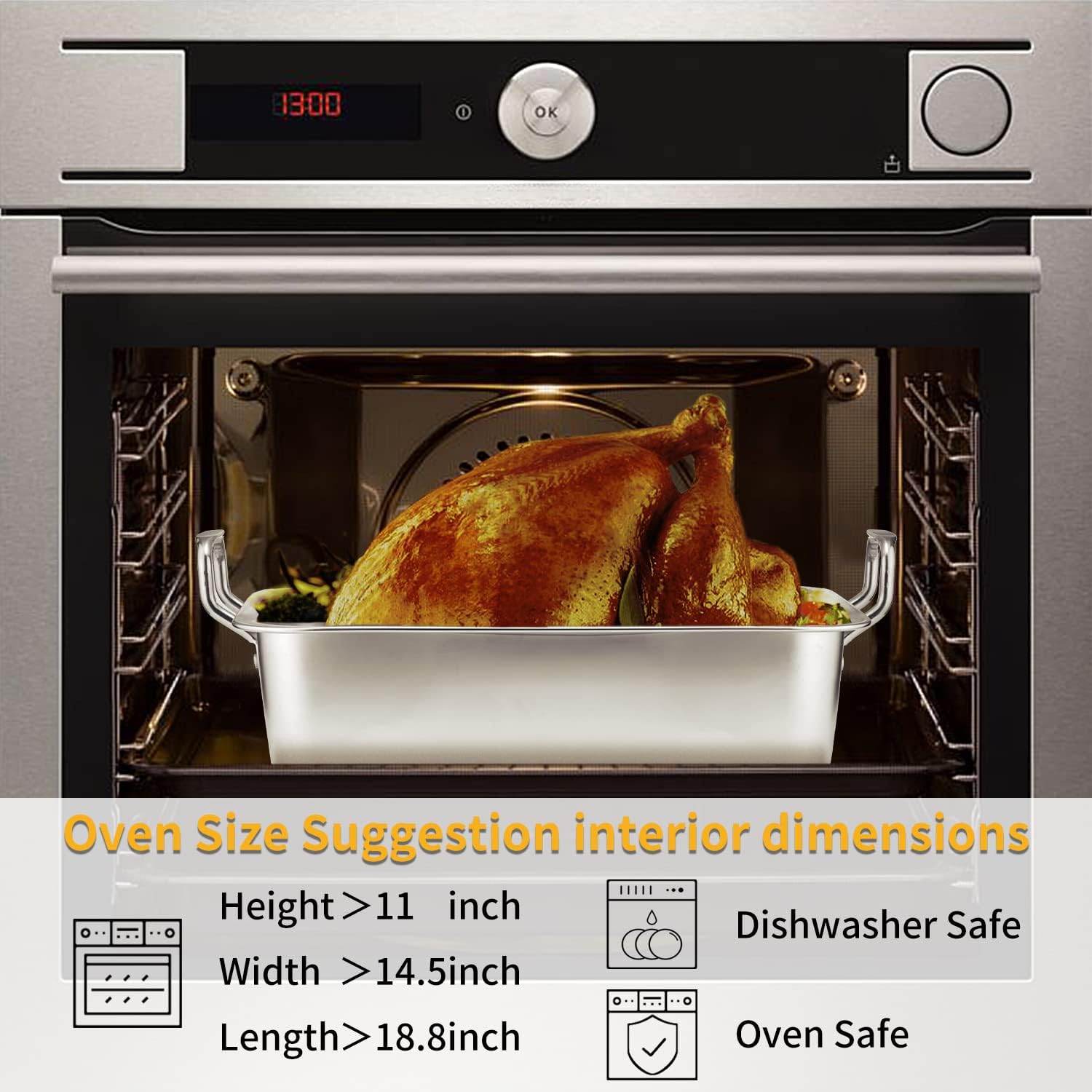 - 【MULTI-USE】Rectangular15.5" x 11.7"× 3.7 inch roasting pan with a turkey baster can holds more food. The turkey roasting pan is ideal for preparing Thanksgiving dinner or Christmas party. Perfect for baking lasagna / vegetables / meat, roasting Turkey / Rib / Brisket.