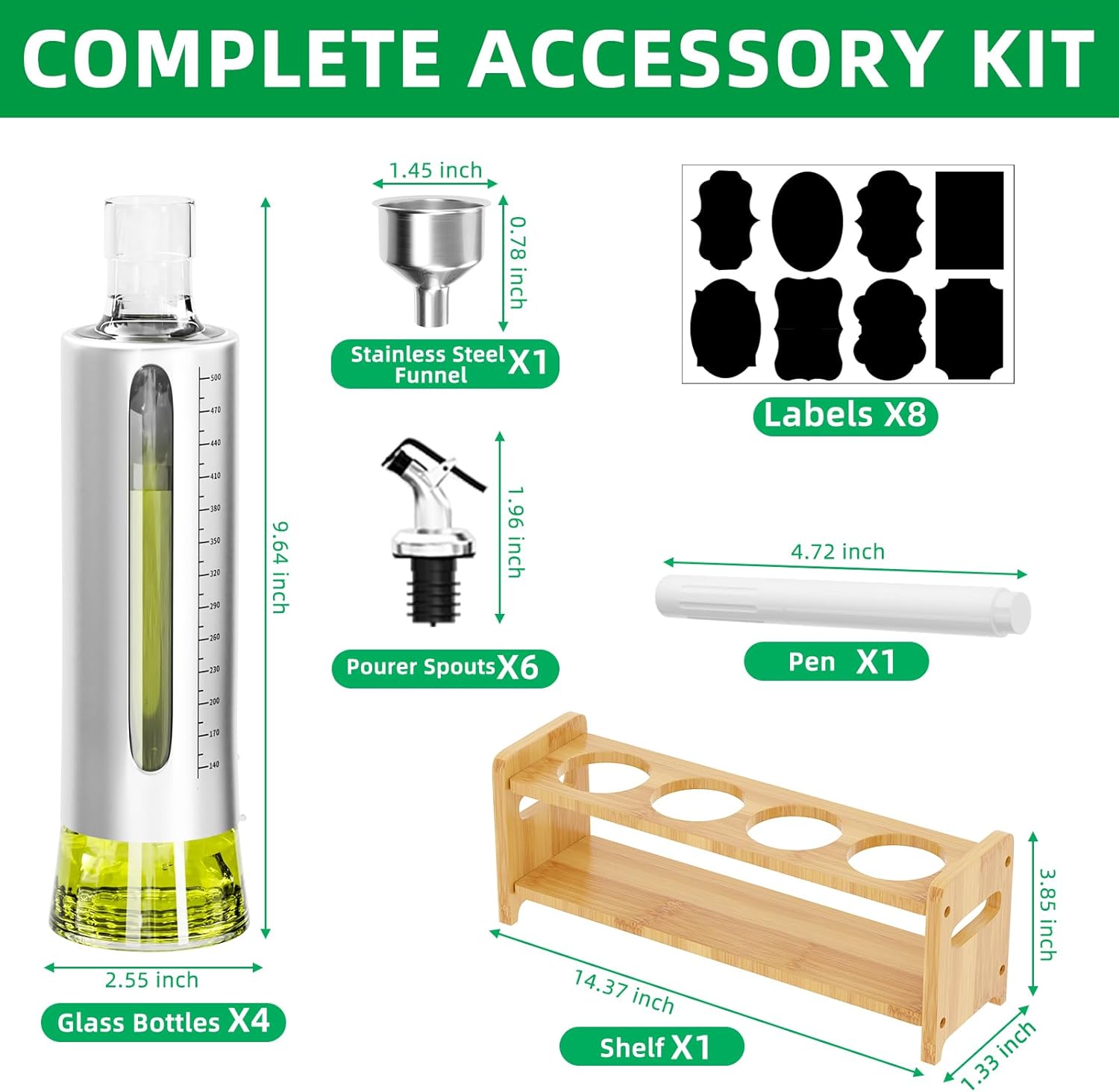 - 【OIL DISPENSER BOTTLE SET INCLUDES】 Our olive oil dispenser bottle includes 4 glass bottles and each can hold 500ml/ 17 fluid ounces,ultra-large capacity for you. In addition, with 6 pourers and a stainless steel funnel. One shelf to help you storage them neatly and find them easily. Cooking oil containers with 1 pen and 8 labels give you the option to write.