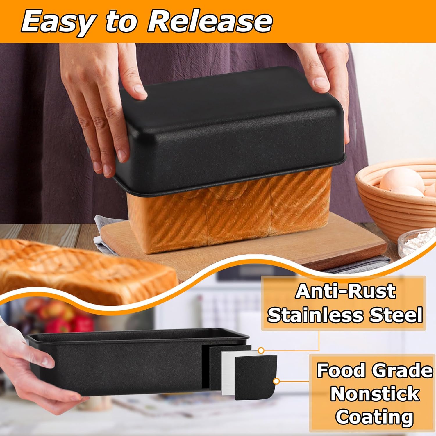- Durable and Healthy Material, loaf bread baking pan is made of heavy-gauge stainless steel with food grade nonstick coating, it can’t chemically react to any food at high temperatures, don’t use a sharp tool to wash that coating can’t peel off and keep bread pan as new, it allows you to have endless baking use for many years