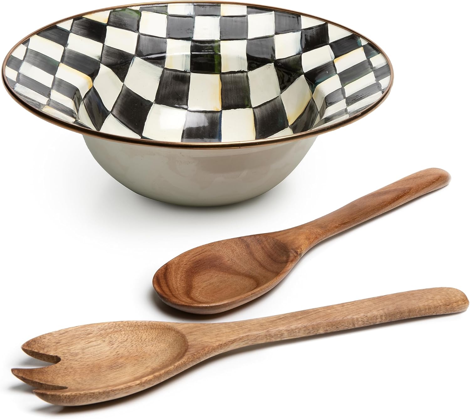 MACKENZIE-CHILDS Enamel Salad Serving Set, Enamel Bowl and Wooden Salad Servers, Decorative Kitchen Set, Black-and-White Courtly Check
