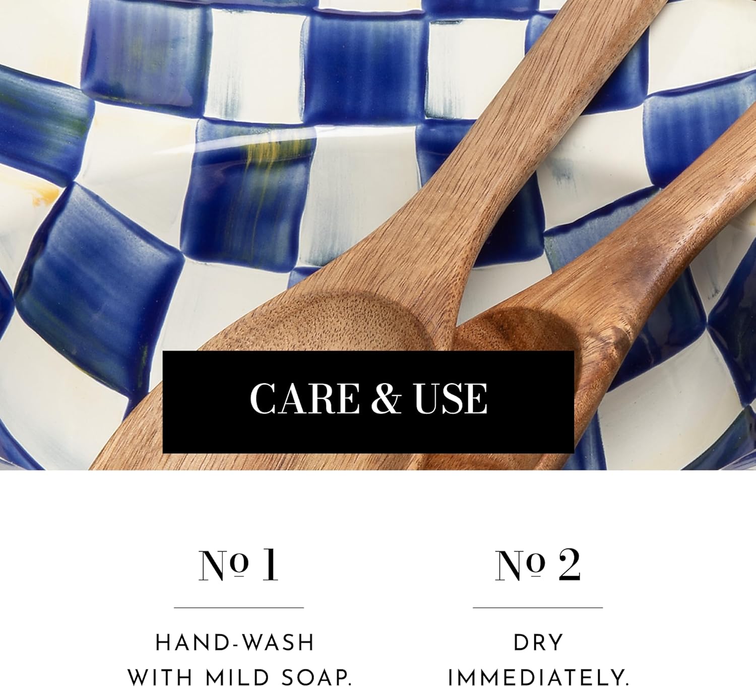 MACKENZIE-CHILDS Enamel Salad Serving Set, Enamel Bowl and Wooden Salad Servers, Decorative Kitchen Set, Blue-and-White Royal Check