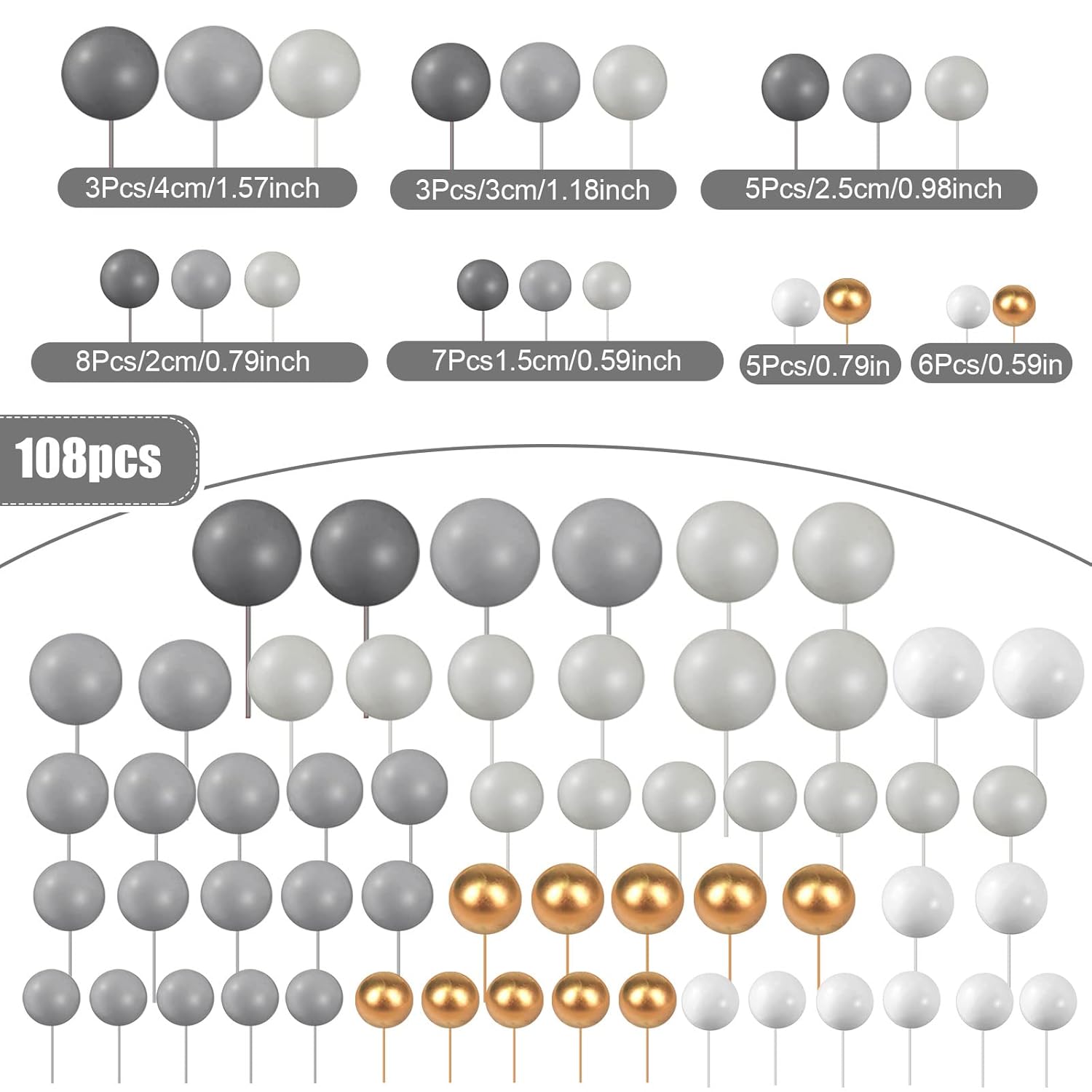 108 Pcs Balls Cake Topper DIY Cupcake Insert Foam Balloons for Cake Baking Wedding Anniversary Birthday Decoration(Dark Gray, Gray, Light Gray,Multi Sizes)