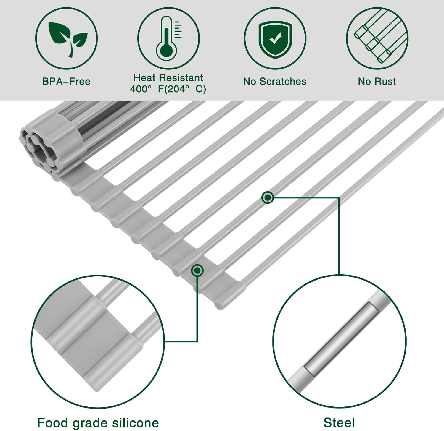 - ✔️ PERFECTLY SIZED: 17.5 x 13.1 inches, works for over sink up to 16.5 inches width. holds your dishes and provides an ideal fit for standard-sized sinks.High-end quality, made of FDA food safe grade silicone wrapped stiff metal steel rods.