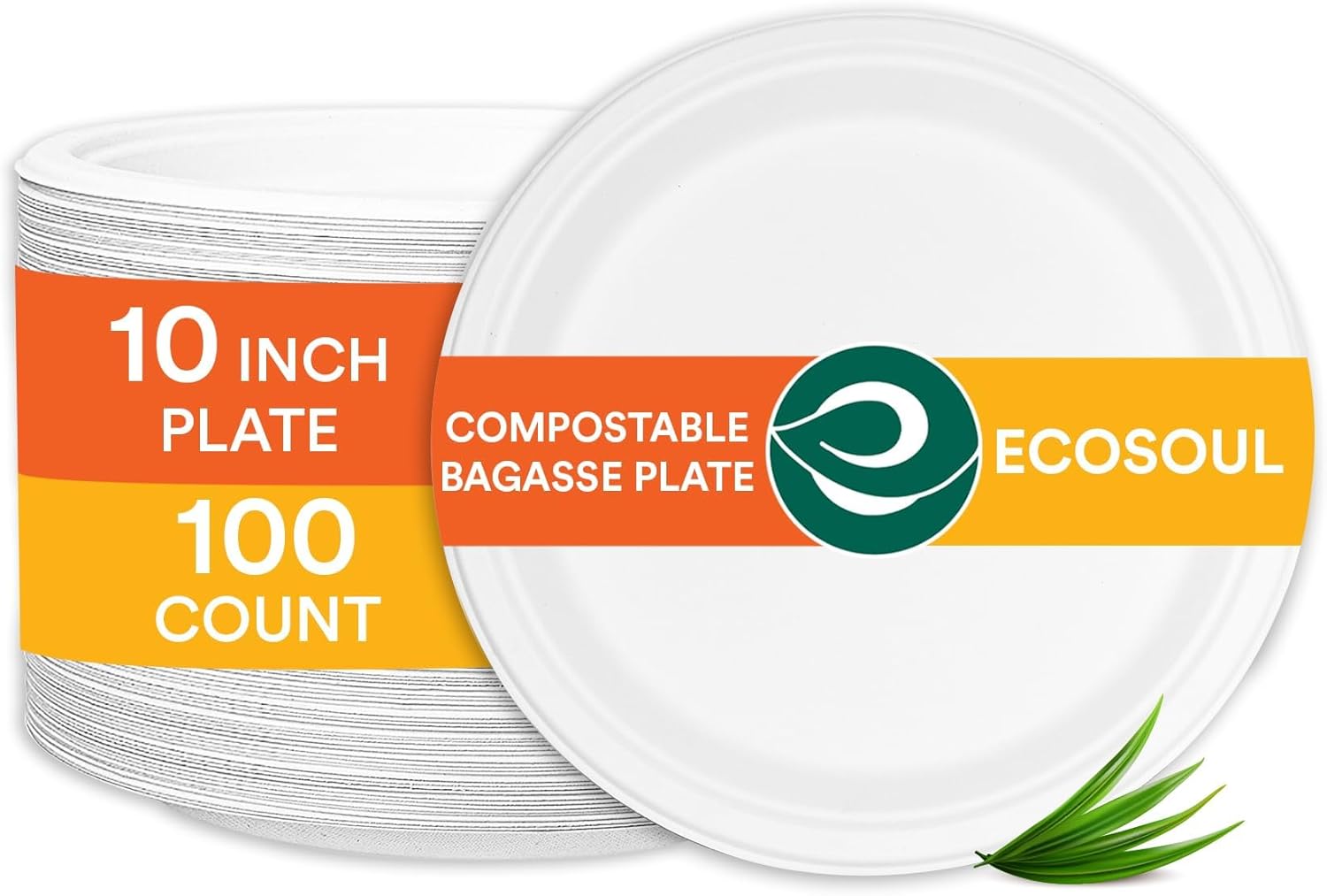 ECO SOUL Pearl White 10 Inch [100-Pack] Paper Plates | 100% Compostable Disposable Bagasse I Heavy-Duty Eco-Friendly Dinner Plates I Biodegradable Sugarcane Eco Plates | Microwavable