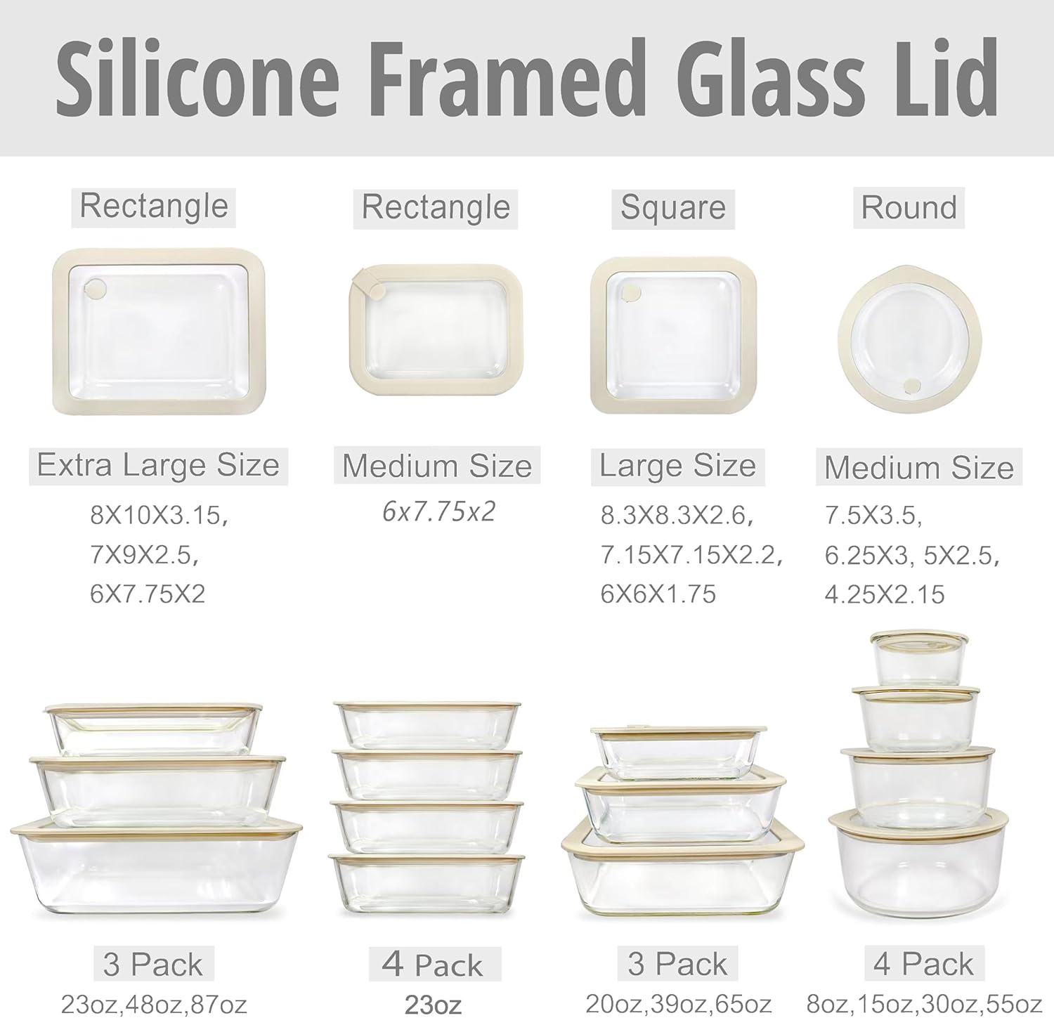 - ✅WHAT’S IN THE BOX: Each set comes with the Glass containers and their matching Silicone Framed Glass Lids. Square Shape Size: 65oz, 39oz, 20oz, (8.3X2.6, 7.15X2.2, 6X1.75)