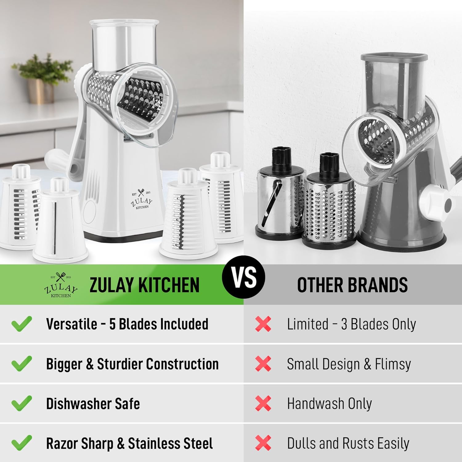 Zulay Kitchen Rotary Cheese Grater 5 Blade Cheese Shredder - Manual Hand Crank Cheese Grater With Reinforced Suction & 5 Interchangeable Drums - Easy to Use, Vegetable Chopper Round Mandoline Slicer