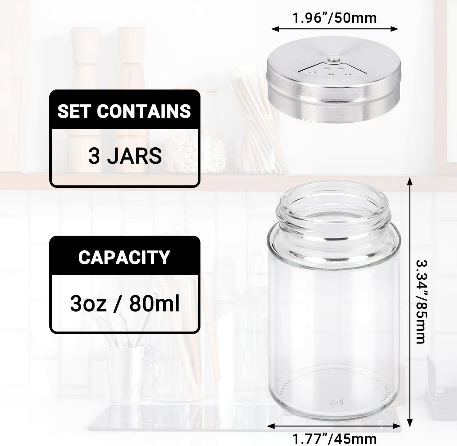 - 3 Pack 3oz Spice Shakers: We offer 3 pack 3oz/ 80ml seasoning jars set, and the spice jars may smaller than expected. We kindly ask that you carefully check the size chart in the product images before purchasing to ensure it meets your needs.