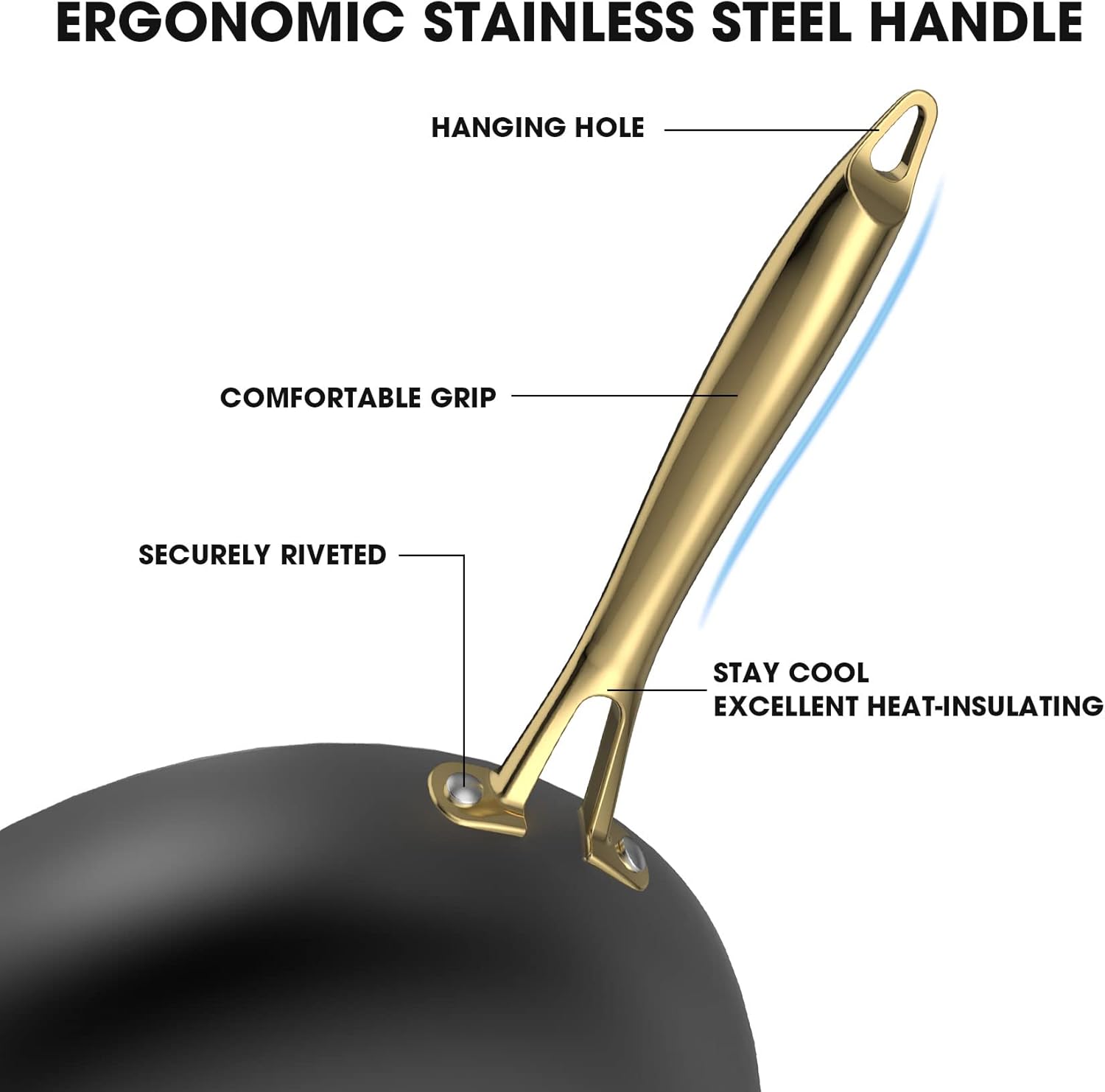 - ERGONOMIC STAY COOL HANDLE: The stainless steel handle of the nonstick frying pan is double riveted for stability, comfortable grip, stylish, durability and secure. Always stays cool on the stovetop so no need to worry about burns. The hanging hole design made the nonstick skillet easy to hang up and convenient for saving kitchen space