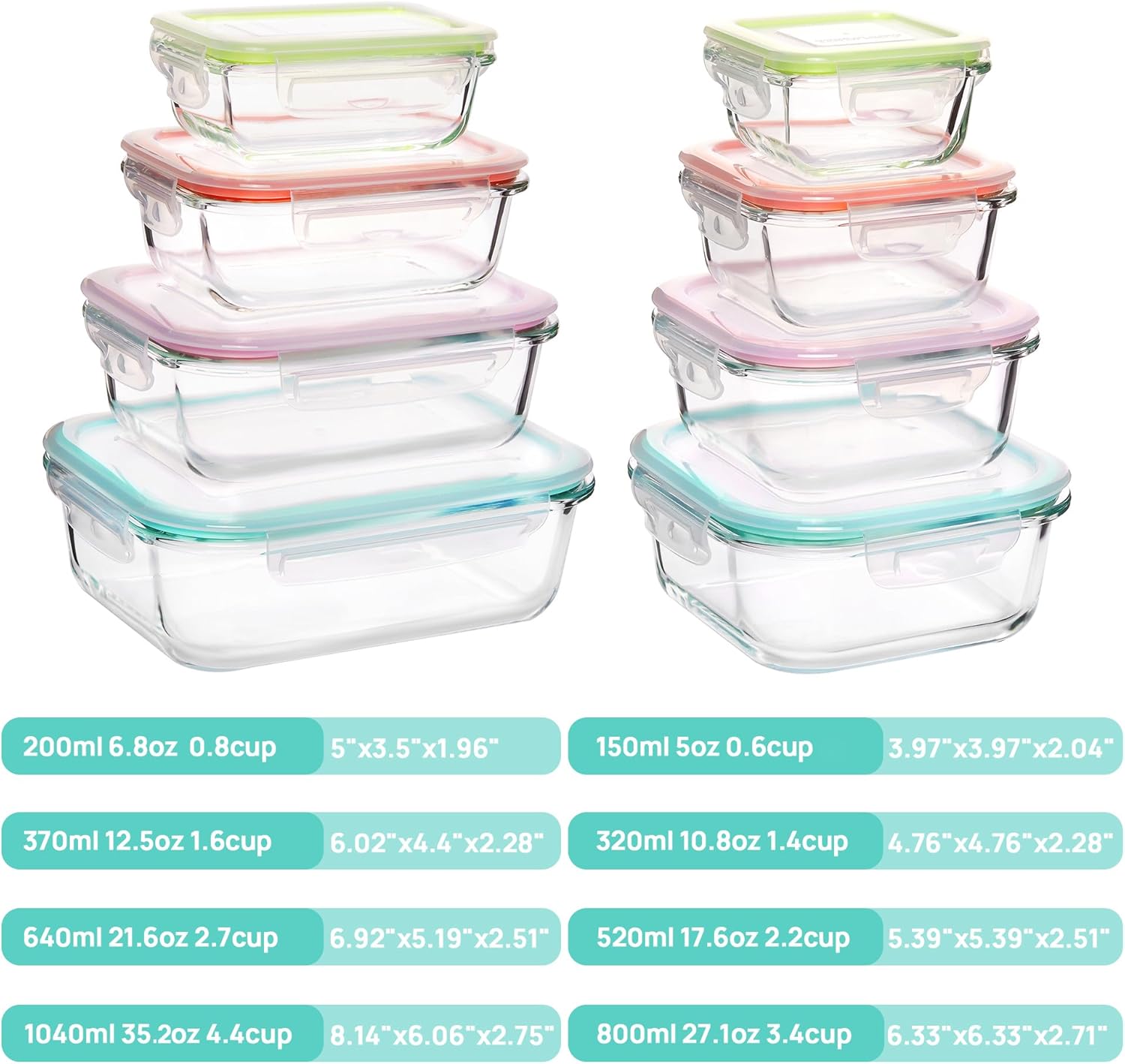- 【Set of 8 Glass Storage Containers】Rectangle (35.1OZ)+(21.6OZ)+(12.5OZ)+(5OZ); Square (27.1OZ)+(17.6OZ)+(10.8OZ)+(6.8OZ); large and small containers are versatile for different use: meal prep food, leftover, sauce, lunch to go, RV, picnic, camping.