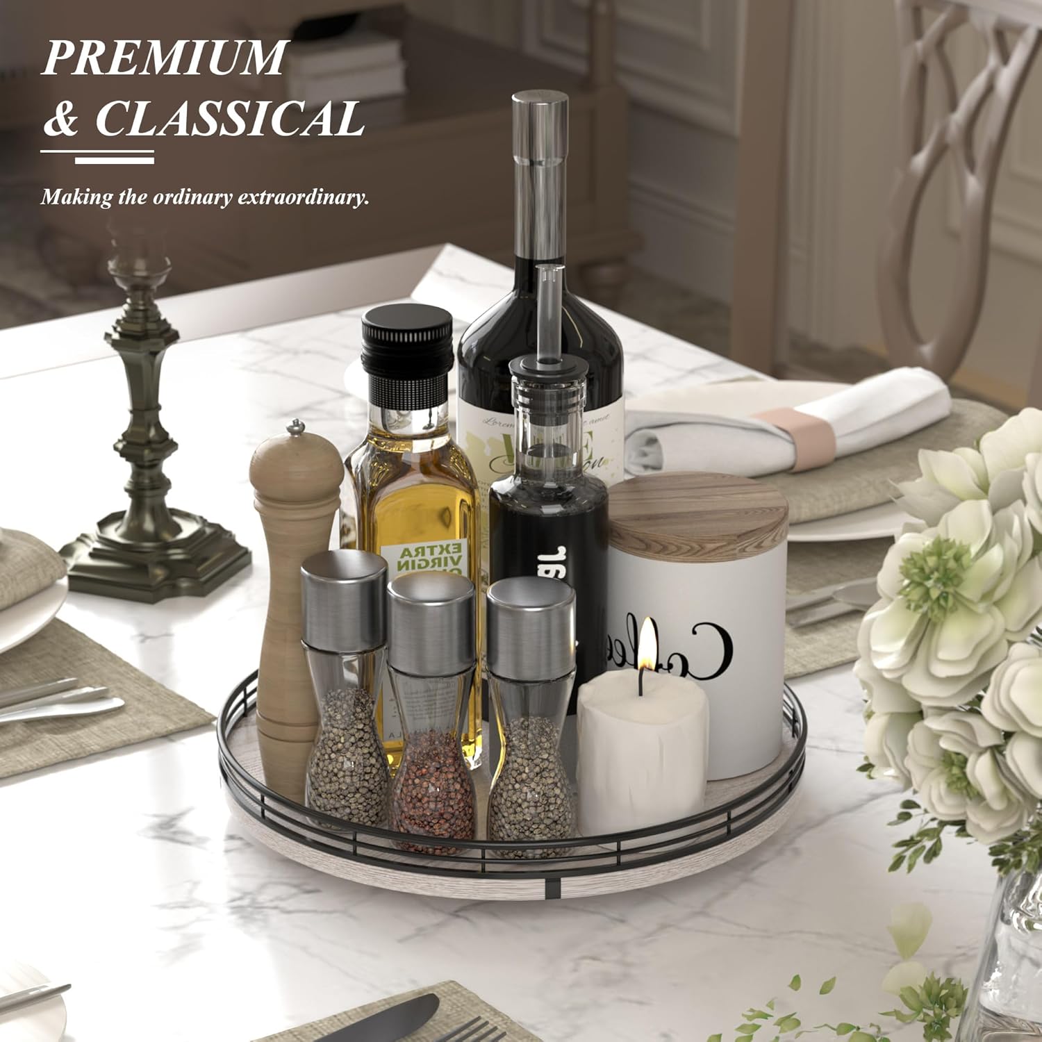 - ππππ πππ πππ ππ: Perfect for a wedding, Birthday, housewarming gift, Mother's Day gift, or centerpiece for any occasions. Tastefully packaged, our turntable organizer makes a thoughtful and practical gift for someone who loves home organization. No assembly was required.
