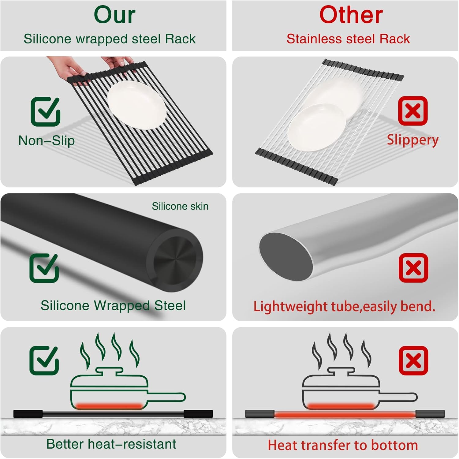 - ✔️ HEAT RESISTANT AND DURABLE: Made of high-quality 18 bars that are coated with silicone, Heat resistant up to 400°F (204°C),Resistant to rust, non-slip, durable, glassware friendly,and sturdier than stainless steel racks.Oil-resistant, very easy to clean. Collapsible, and rolls up for easy storage.