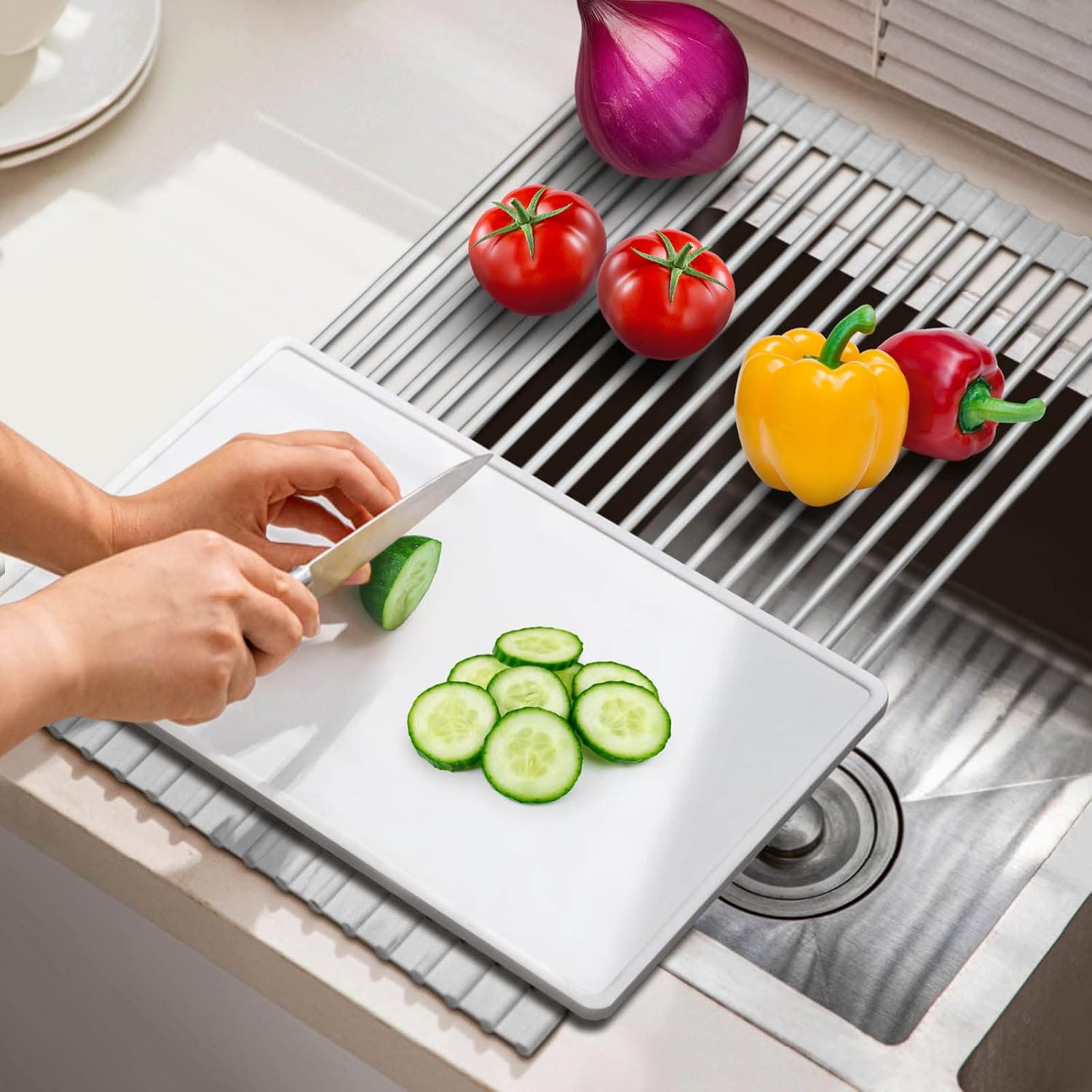 - ✔️ EASY TO STORE:Multipurpose rollable over sink dish drying rack for kitchen does not require any assembly,It can be folded to take up less space. Rolls up nicely to stand under the sink for storage, or in a drawer or cabinet when you need to use the sink,The sink rack can free up much more counter space than traditional dish drainer.