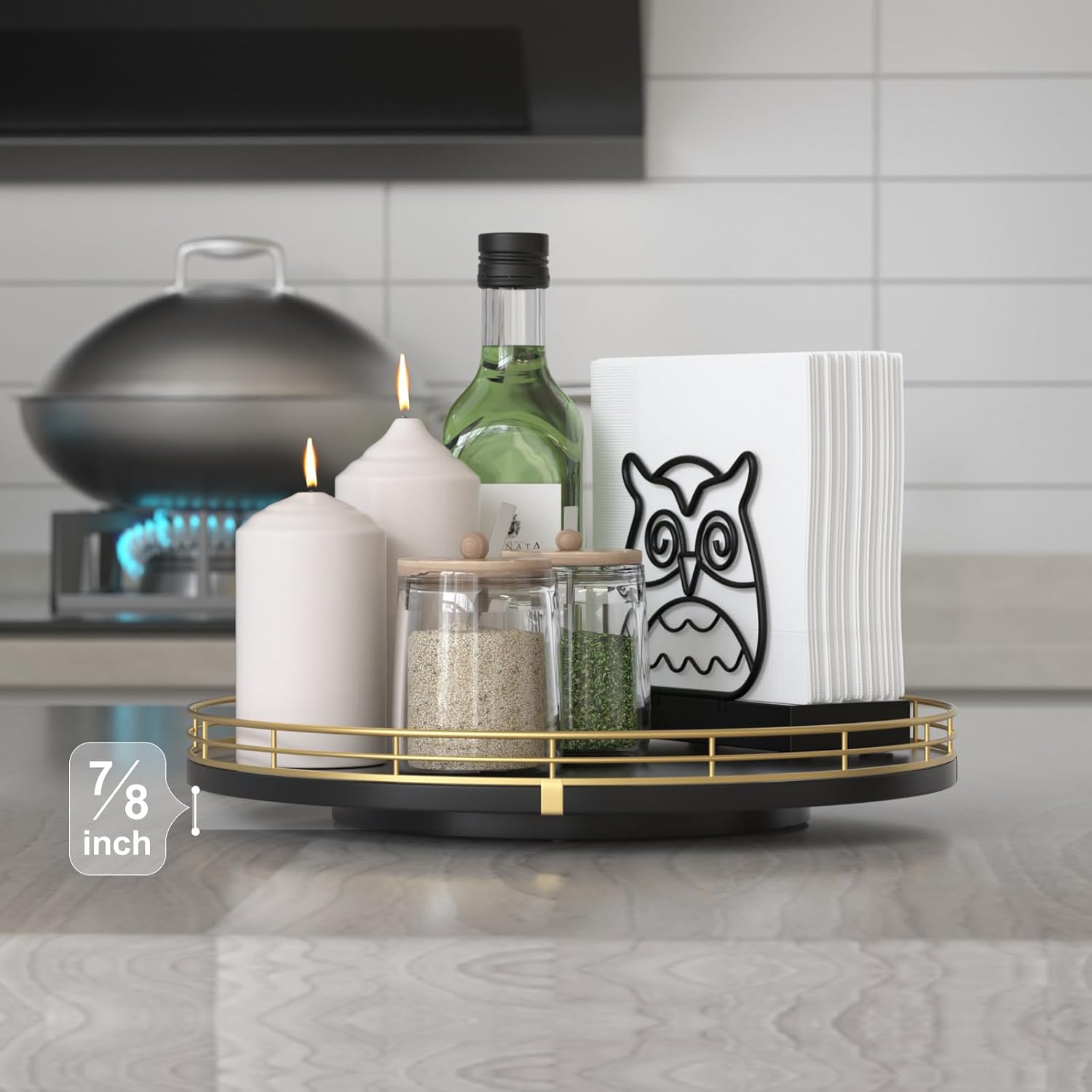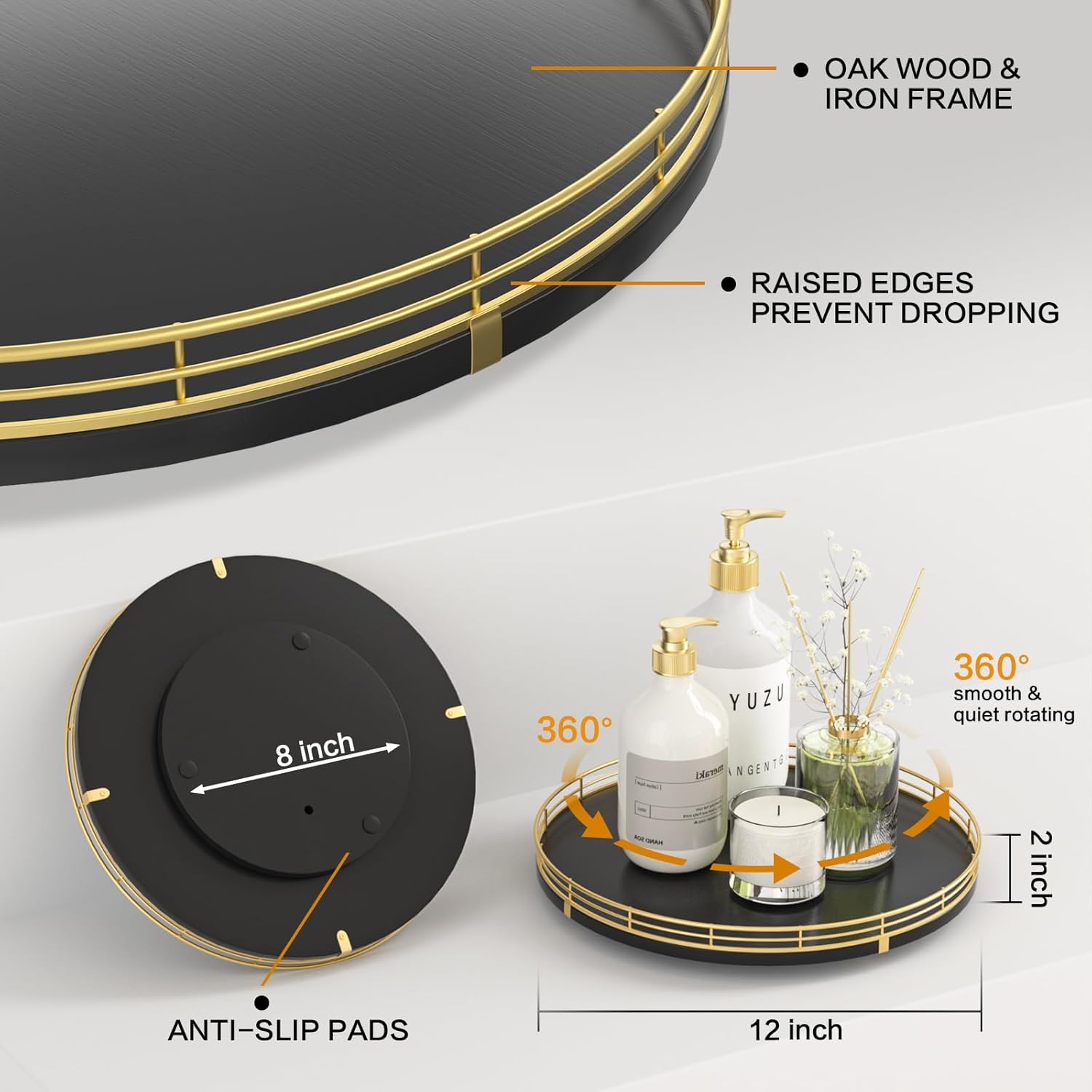 - ๐ง๐ต๐ผ๐๐ด๐ต๐๐ณ๐๐น ๐๐ฒ๐๐ถ๐ด๐ป: The turntable tray features a smooth and silent 360ยฐrotation; Bottom slip-resistant pads for stability and protect your countertop from scratches; Raised edges on each organizer tray to keep items from falling out; Easy to use, no installation required