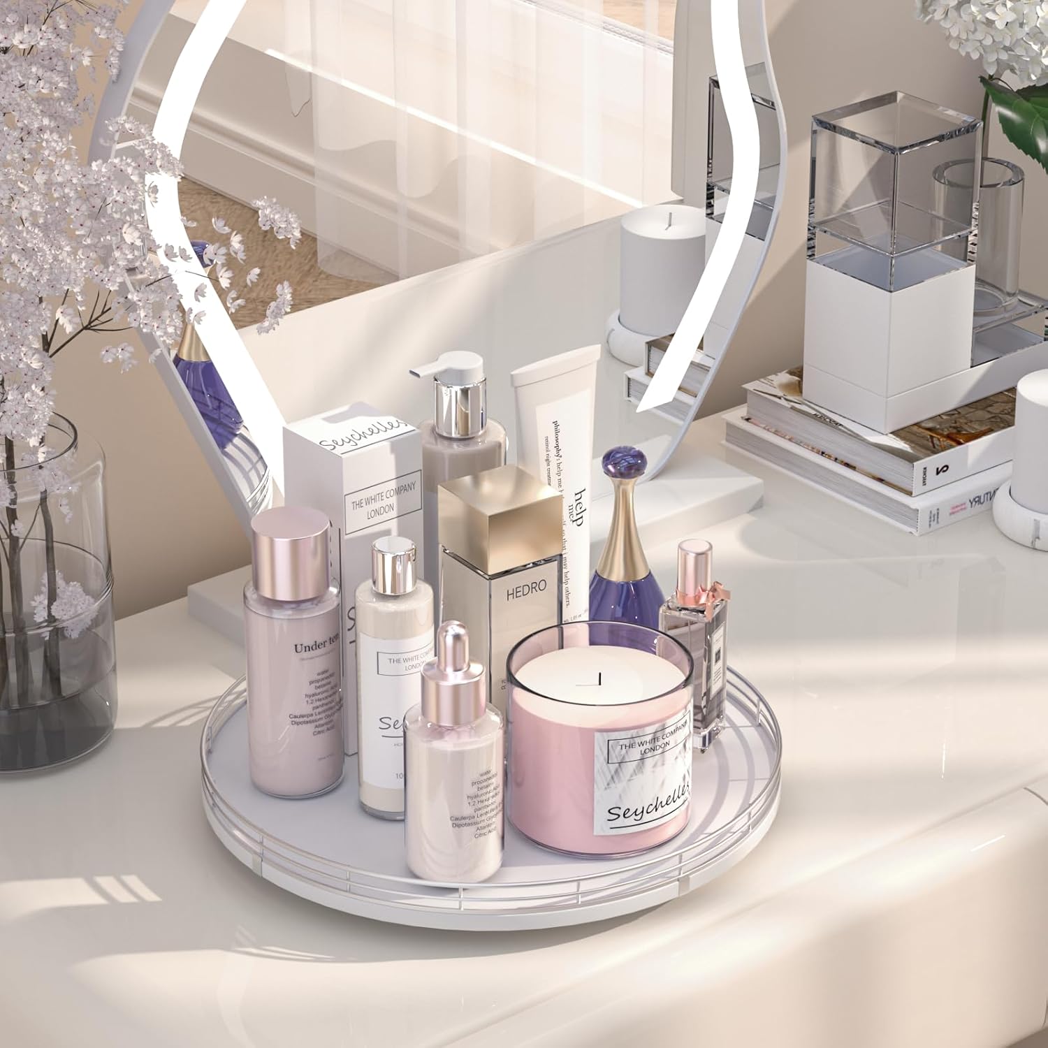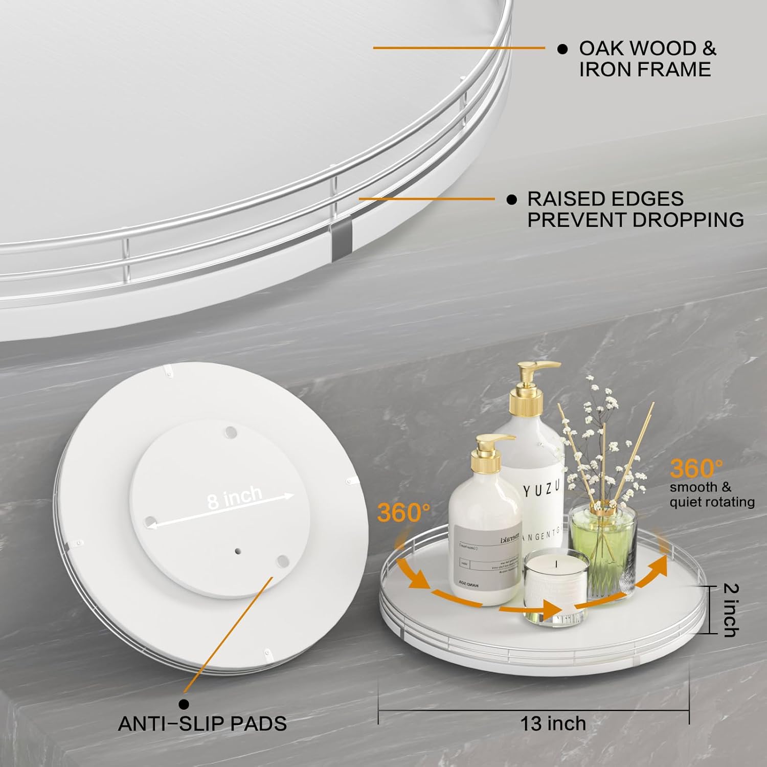 - ๐ง๐ต๐ผ๐๐ด๐ต๐๐ณ๐๐น ๐๐ฒ๐๐ถ๐ด๐ป: The turntable tray features a smooth and silent 360ยฐrotation; Bottom slip-resistant pads for stability and protect your countertop from scratches; Raised edges on each organizer tray to keep items from falling out; Easy to use, no installation required
