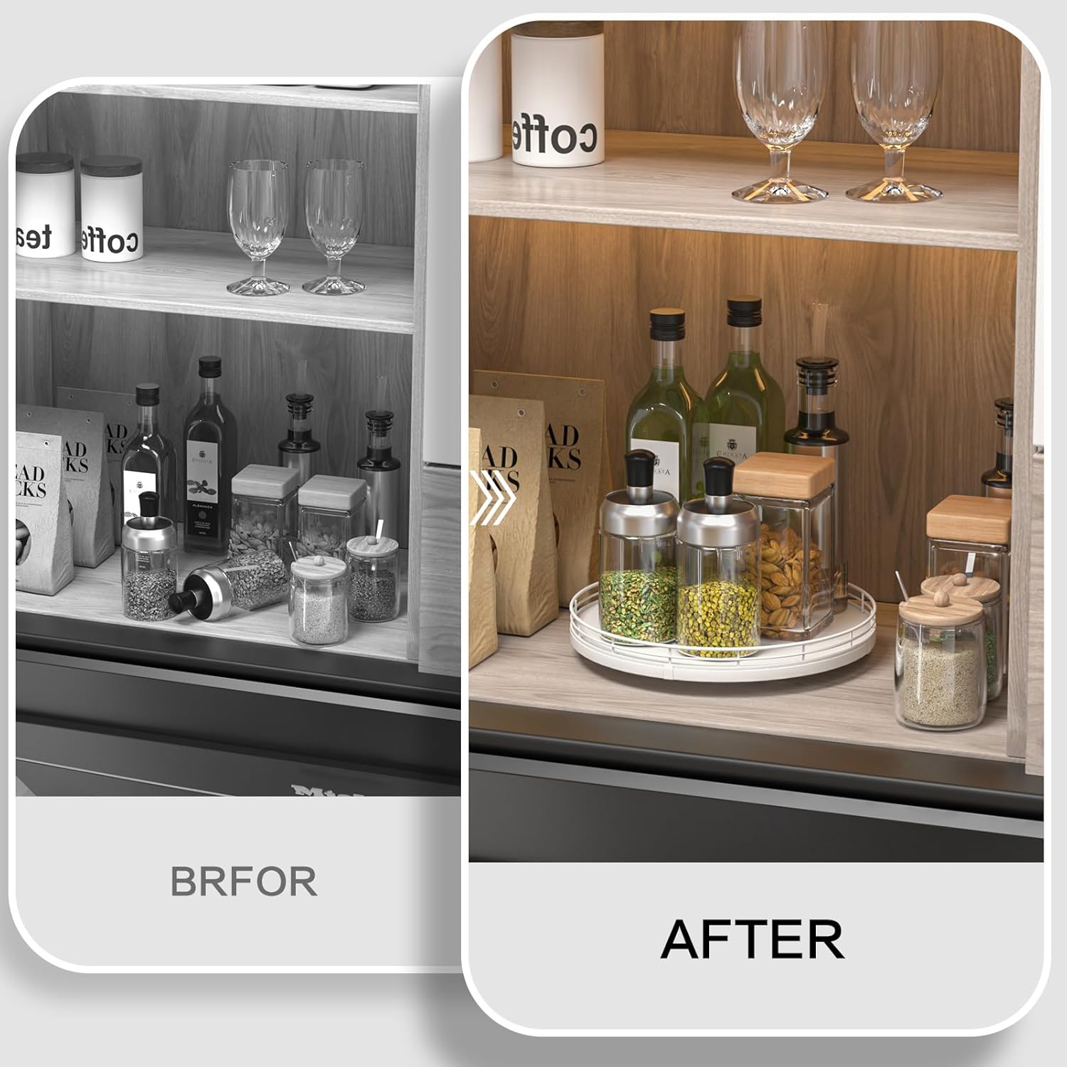 - ๐ง๐ต๐ผ๐๐ด๐ต๐๐ณ๐๐น ๐๐ฒ๐๐ถ๐ด๐ป: The turntable tray features a smooth and silent 360ยฐrotation; Bottom slip-resistant pads for stability and protect your countertop from scratches; Raised edges on each organizer tray to keep items from falling out; Easy to use, no installation required