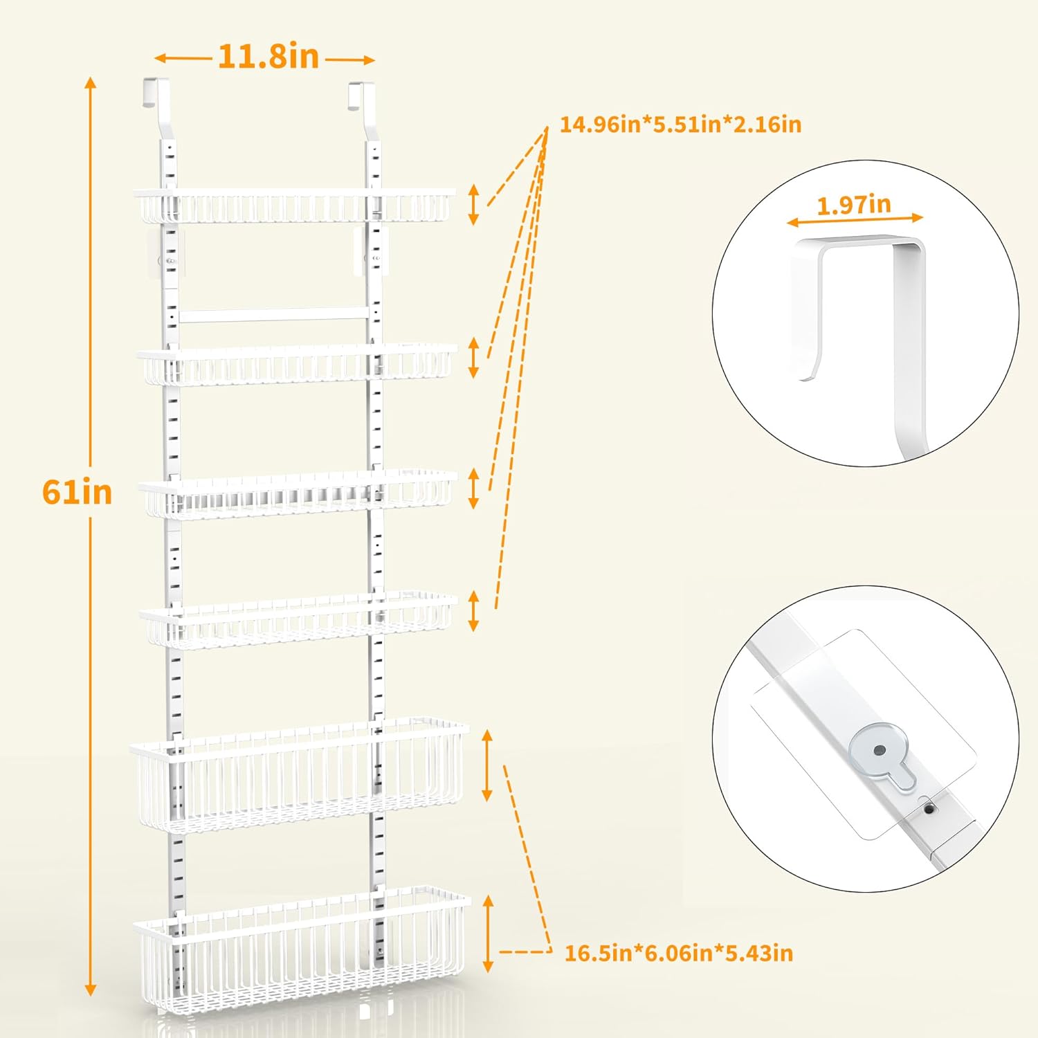 - You will get 2 large shelves (16.5"L x 6"W x 5.4H"), 4 medium shelves (14.9"L x 5.5"W x 2.1H"), including all necessary mounting hardware. The overall height after installation is 6.1ft, suitable for most doors. USPTO Patent Number:29884989.