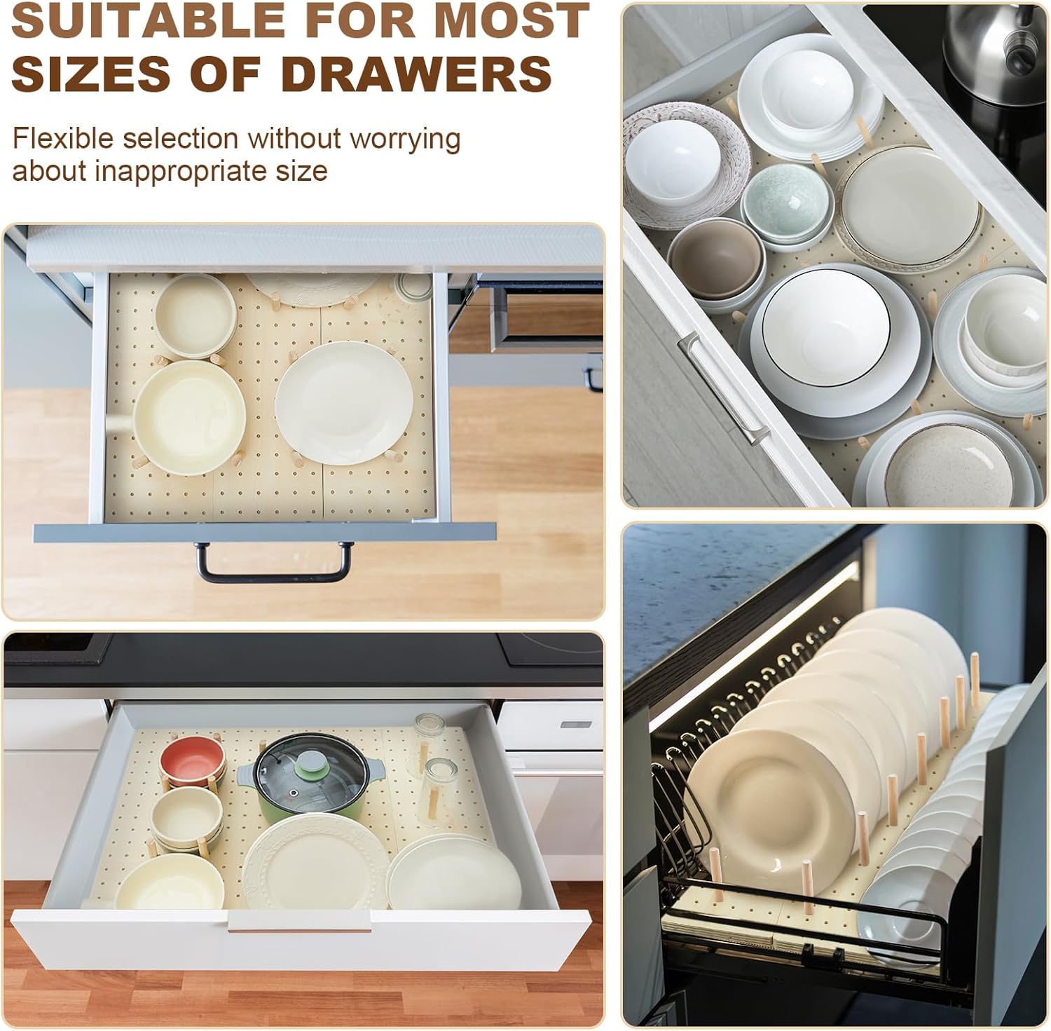 - Package Information: the package includes 12 peg drawer organizers for dishes and 96 adjustable wooden pegs, together making 108 pieces; This generous count is ideal for arranging your kitchen drawers, side sinks, countertops, and more, injecting order into your kitchen chaos