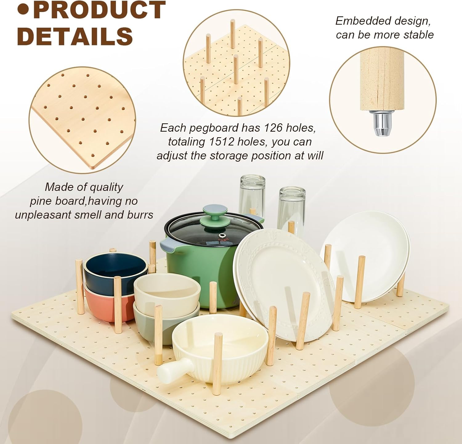- Quality Material: the peg board drawer organizer is made from reliable wood, which is sturdy, and not prone to breakage and deformation; The product presents no unpleasant smell or burrs, ensuring your kitchen accessories are safe and reliable; It's advisable to keep the wooden peg board at a distance from water to avoid mold growth