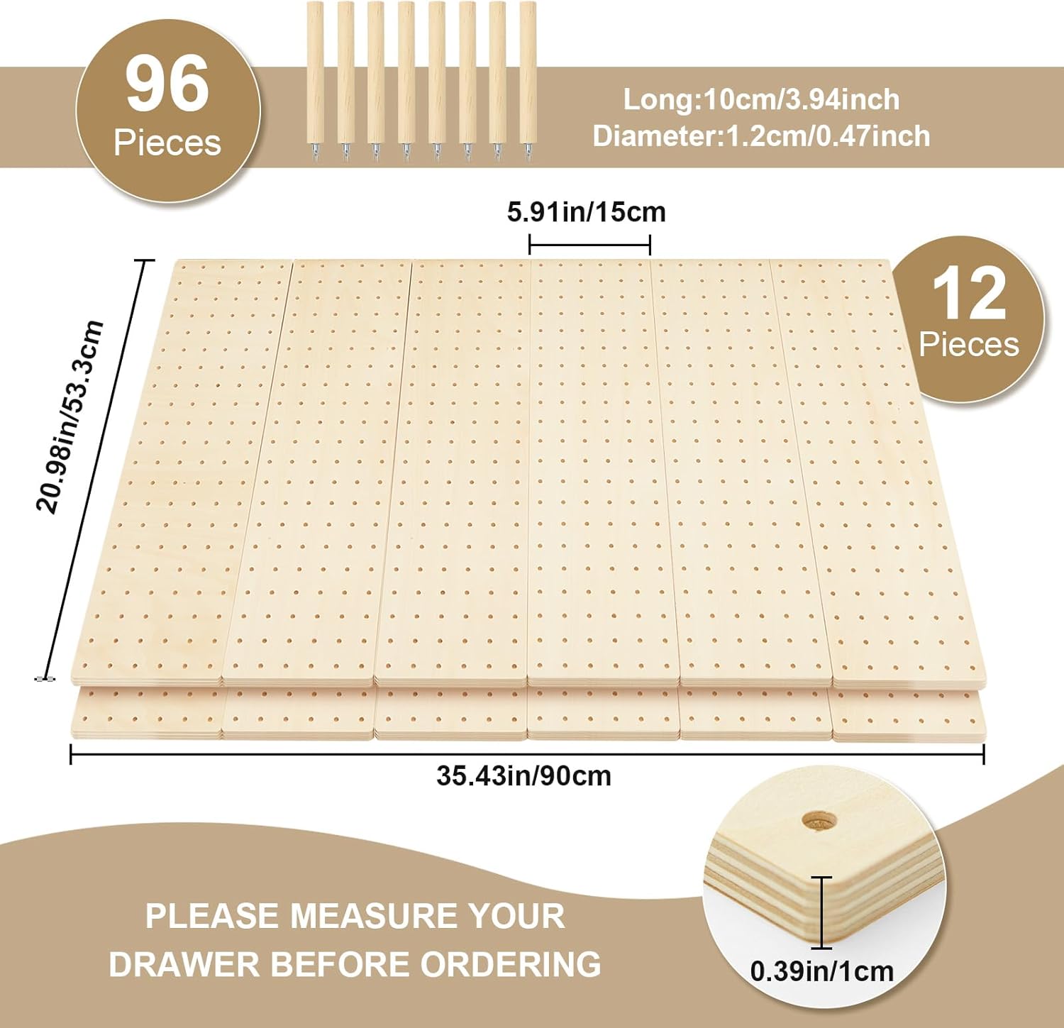 Kigley 12 Pcs Pegboard Drawer Organizer with 96 Drawer Peg Wood Peg Board Wooden Kitchen Plate Organizer for Dishes Food Containers Cookware Utensils(21 Inch,Wood Color)