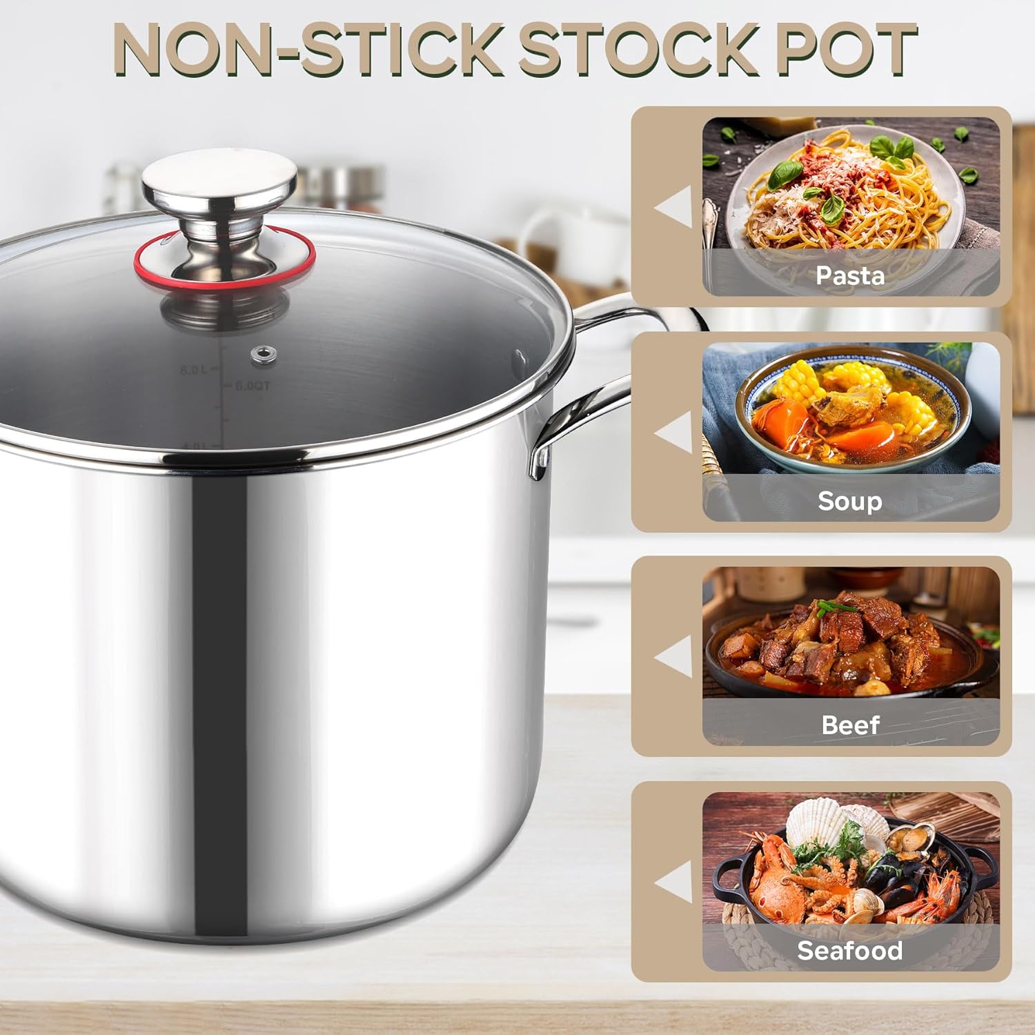- Know Cooking Process Easily, tall canning stock pot with a transparency glass lid, you can see through the process while cooking without taking the lid off, The 10qt stainless pot has an air vent that keeps it from completely fogging up, and keeps the condensation down, has not as much soup running down the sides, keeping the outside of the pot clean during cooking, a great addition to the induction& stove cookware