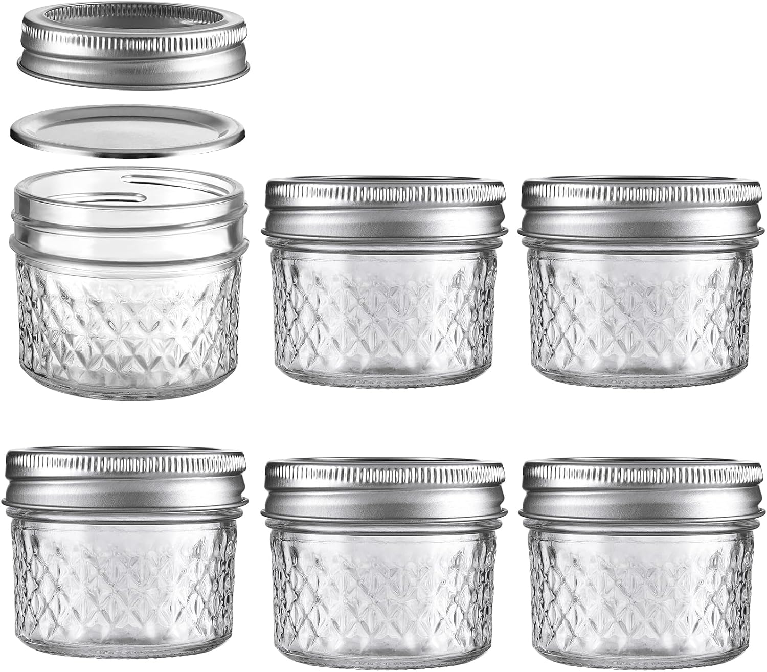 - 【SET INCLUDES】: you can receive 6 empty mason jars 3.4 oz, 6 split-type lids. Also attached with a sponge brush for easy clean. These canning jars is perfect for your daily use.Hope you will enjor them!