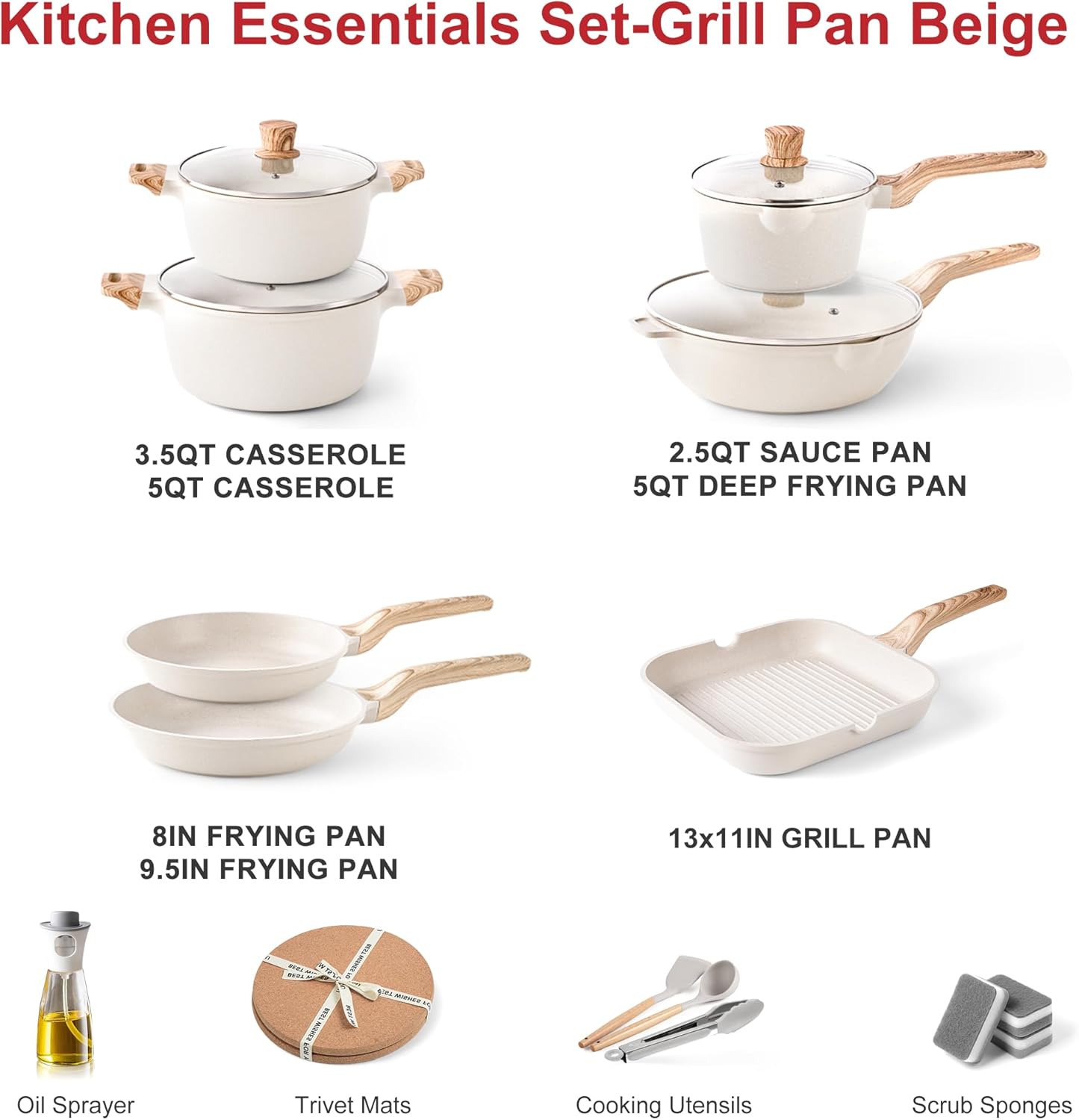 Caannasweis 20Pcs Cookware Sets, Nonstick Pots and Pans Set, Granite Induction Cookware, Non Stick Kitchen Cooking Set, Grayish White Grill Pan Set, PFOS PFOA Free