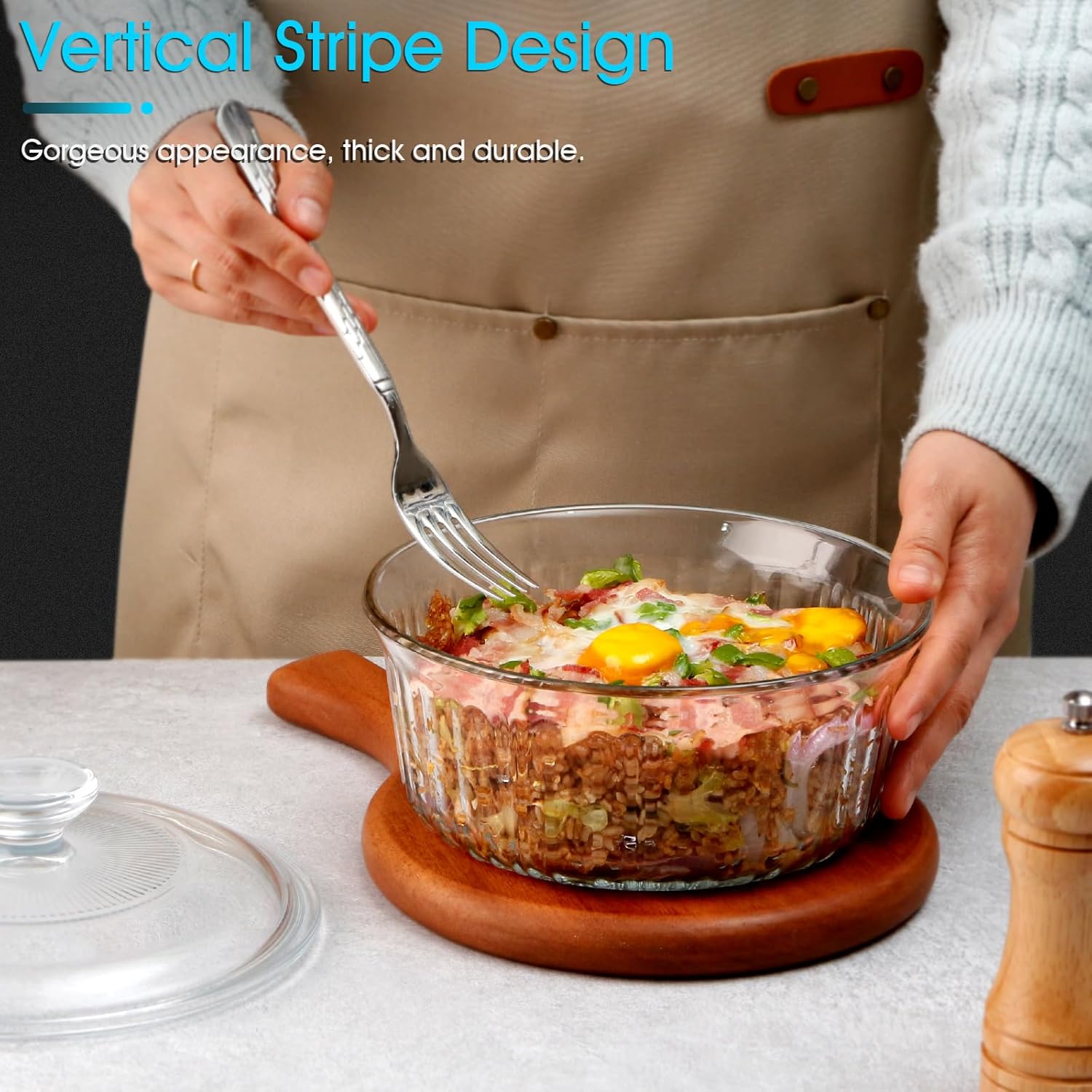 - 【Elegant and Stylish Design】NUTRIUPS Glass Casserole Dish features a vertical stripe design that adds a touch of elegance and style to your kitchen. Whether you're serving a family dinner or hosting a party, this round casserole dish with lid will impress your guests with its sophisticated look.