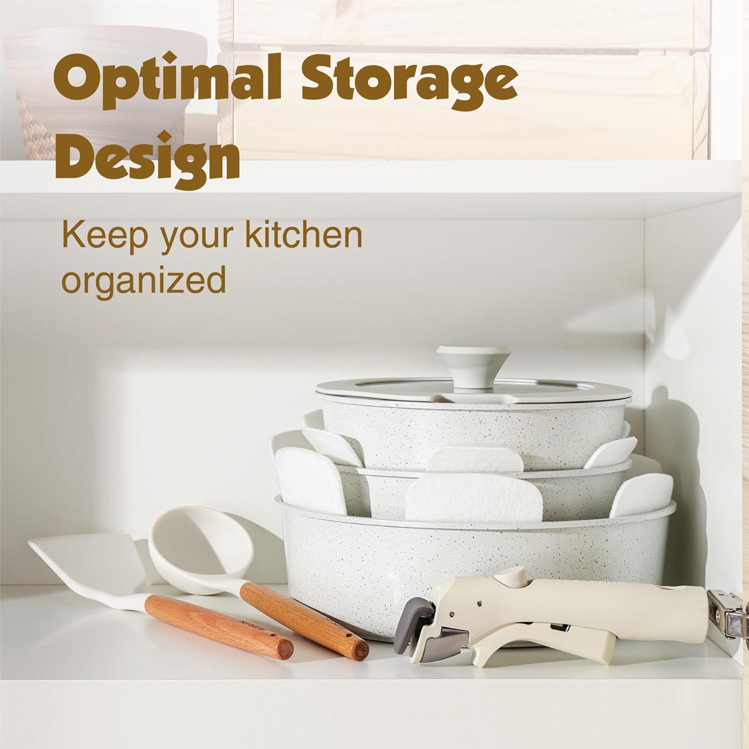 - Easy Storage - Save up to 70% more space with stackable pots and pans set and detachable handles, allowing for storage in cabinets or RVs.