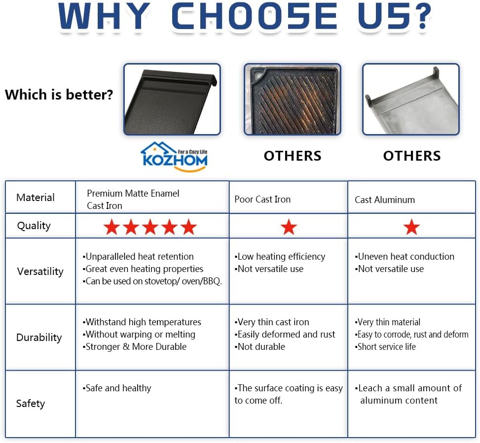 - ✔ VERSATILE CAST IRON - Cast iron griddles are highly regarded for their unparalleled heat retention and even heating properties. Due to its strength and ability to withstand high temperatures without warping or melting, it is more durable than cast aluminum griddles. It can be used on your stovetop, in your oven and even on your BBQ.
