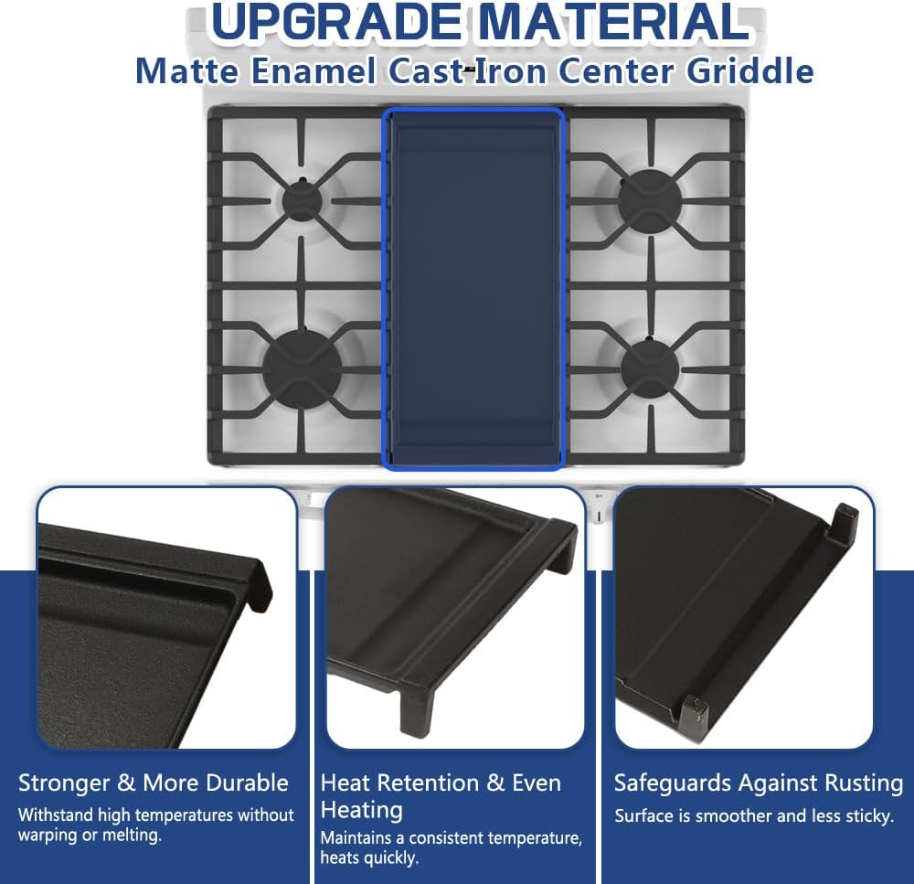 - ✔ UPGRADE MATERIAL - The WB31X24738 Gas Range Griddle for GE is made of premium matte enamel cast iron that more durable, not easy to deform, with a longer service life. Upgraded surface manufacturing process makes the surface smoother and less sticky than others. Use less oil to cook delicious food.