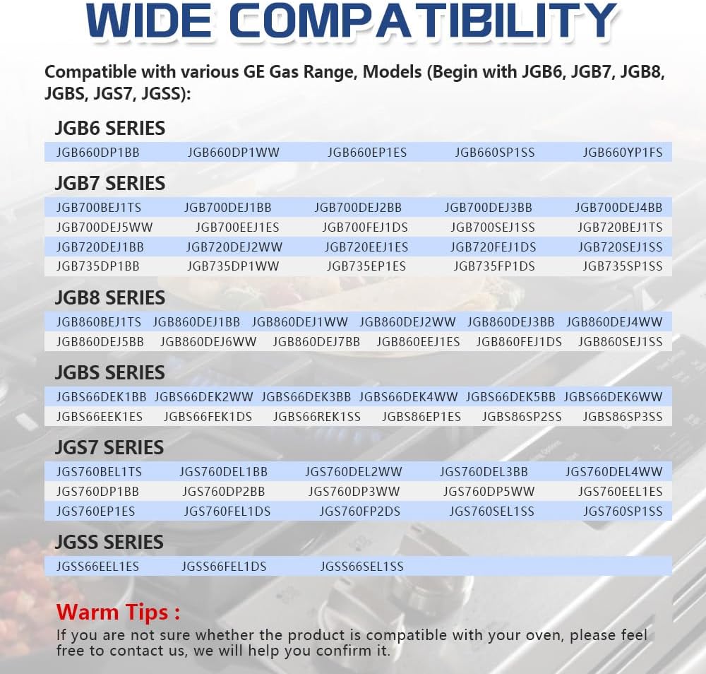 - ✔ IDEAL REPLACEMENT - This Gas Stove Top Griddle Plate is compatible with various GE gas range, models begin with JGB6, JGB7, JGB8, JGBS, JGS7, JGSS. Replaces part numbers: WB31X24738, WB31X24998, AP5986291, EAP11725207, PS11725207, 4322558. If you are not sure whether the product is compatible with your stove, please feel free to contact us, we will help you confirm it.