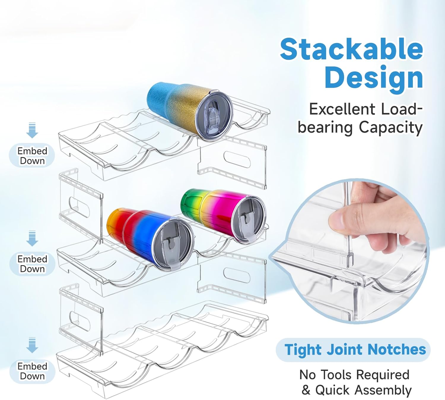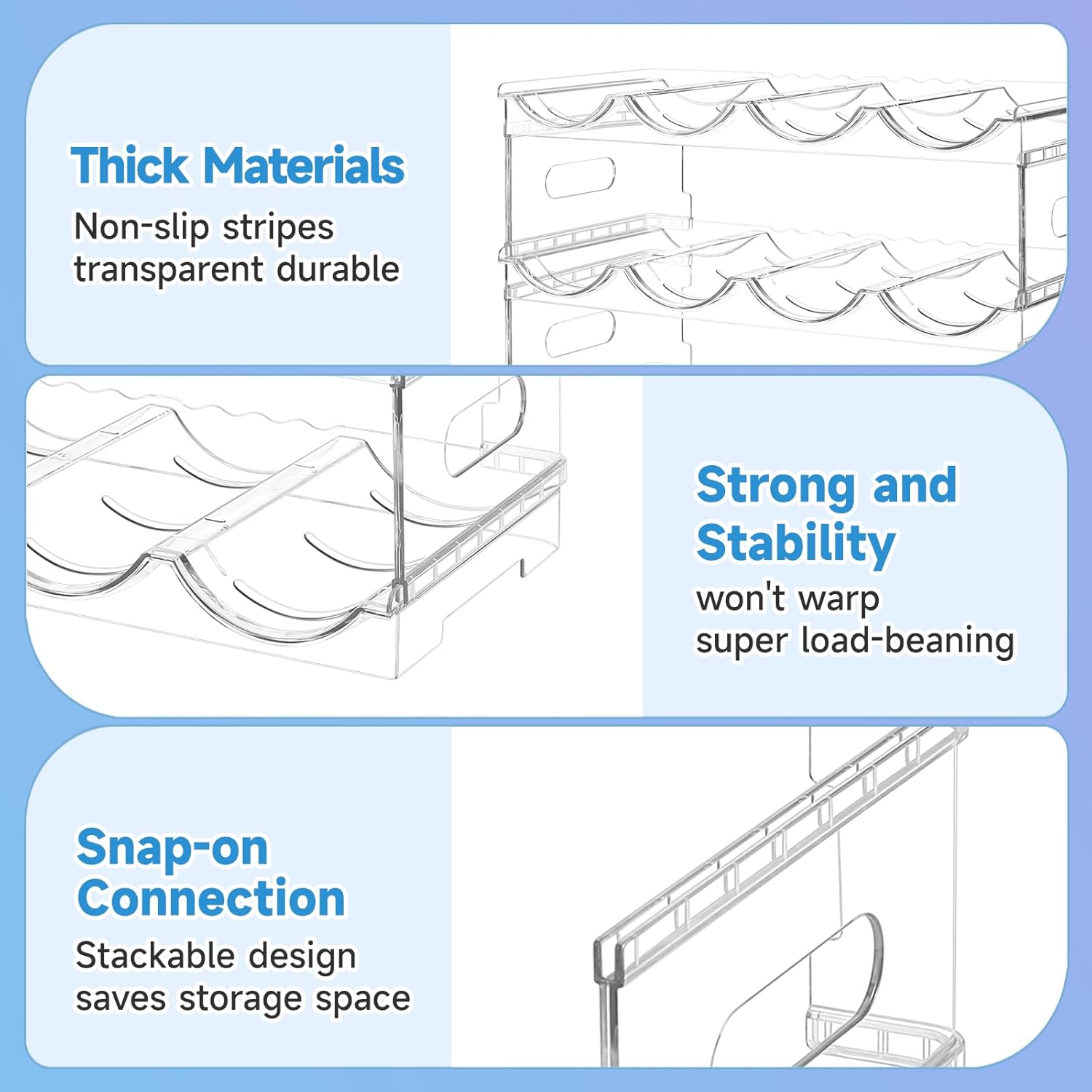 - HIGH-QUALITY MATERIALS: This water bottle organizer is made of high-quality, shatterproof, and transparent PET material. It has a strong load-bearing capacity, ensuring stability and preventing wobbling. This shelf can be used to store champagne, water bottles, soda, drinks, and more, making it much easier to access the bottle you want without having to move others in the cabinet.