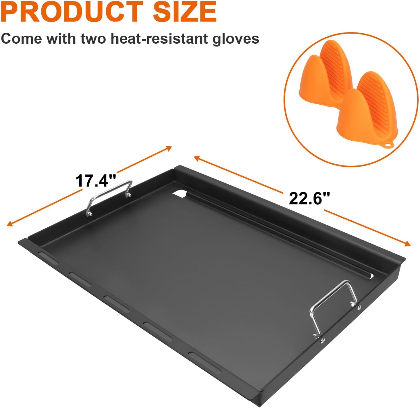 - 【Convenient Handles and Gloves】Coming with handles and gloves are handy for moving the griddle. The griddle insert measures 22.6 L x 17.4 W inches. Our full-size griddle insert, made of high-quality materials, is nonstick, more durable and heats up faster than other griddles.