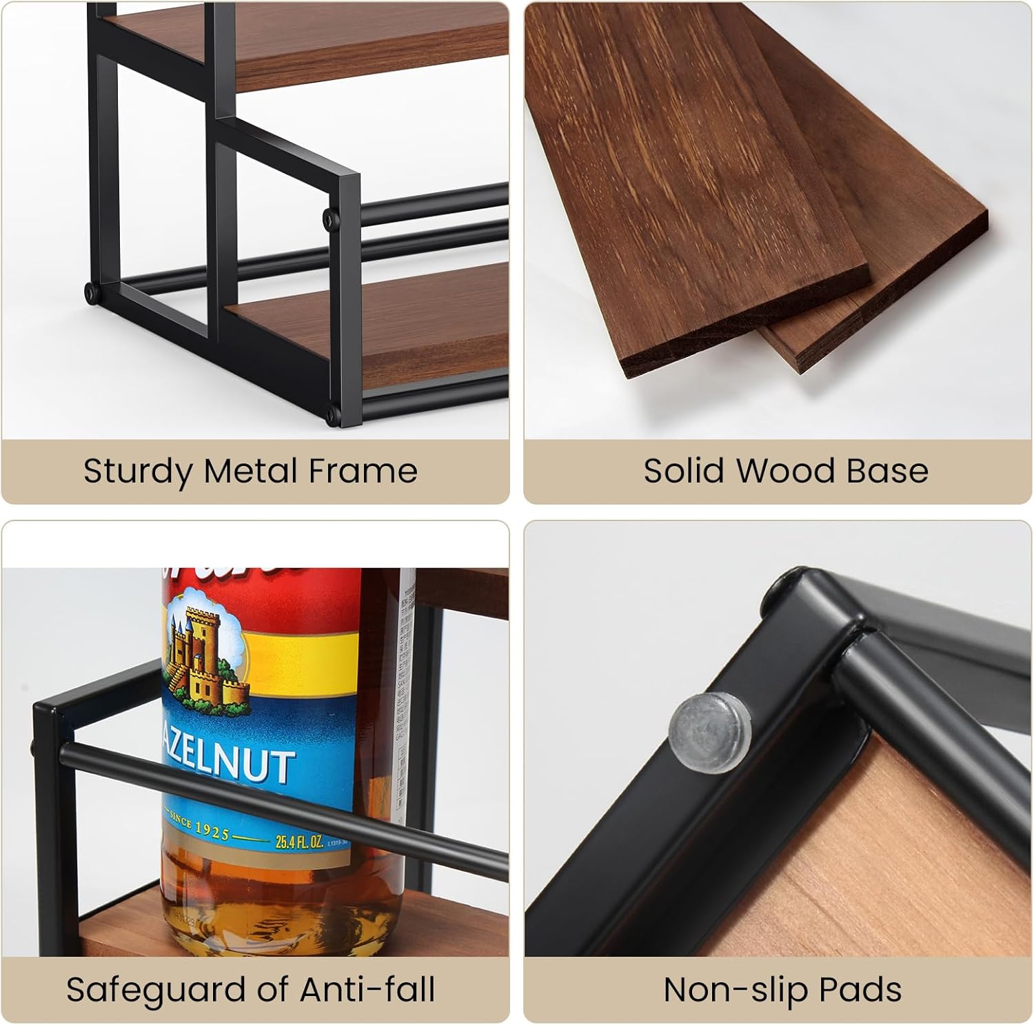 - 【Sturdy & Stable】The metal construction of the syrup holder is strong enough, and the height between each tier is carefully designed to ensure that you can use the syrup pump while the bottle is on the rack.