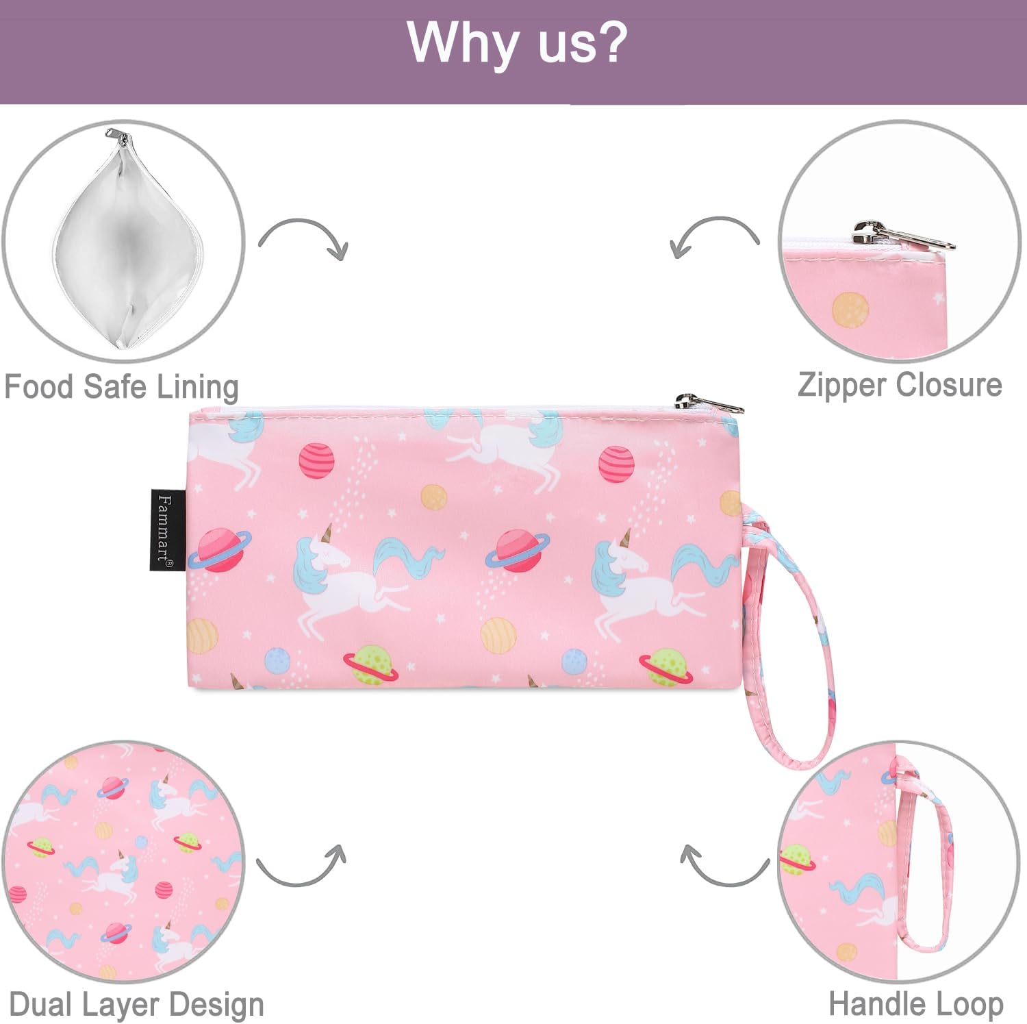 Reusable Sandwich Bag/Snack Bag for Kids & Adults, Dual Layer Lunch Bag with Handle, Washable, Food Safe, BPA Free (2-Pack, Planet Unicorn)
