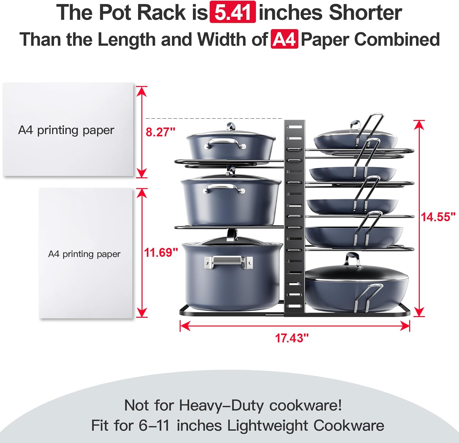 - Ensure Proper Fit By Measuring Cabinet Size - Minimum Cabinet Size Required is Width≥21'' and Height≥17''. The height of the Pot Rack is 5.41 inches Shorter Than the Length and Width of A4 Printing Paper Combined The ORDORA cabinet organizer comfortably accommodates 6-11 inch LIGHTWEIGHT cookware except for heavy-duty cookware
