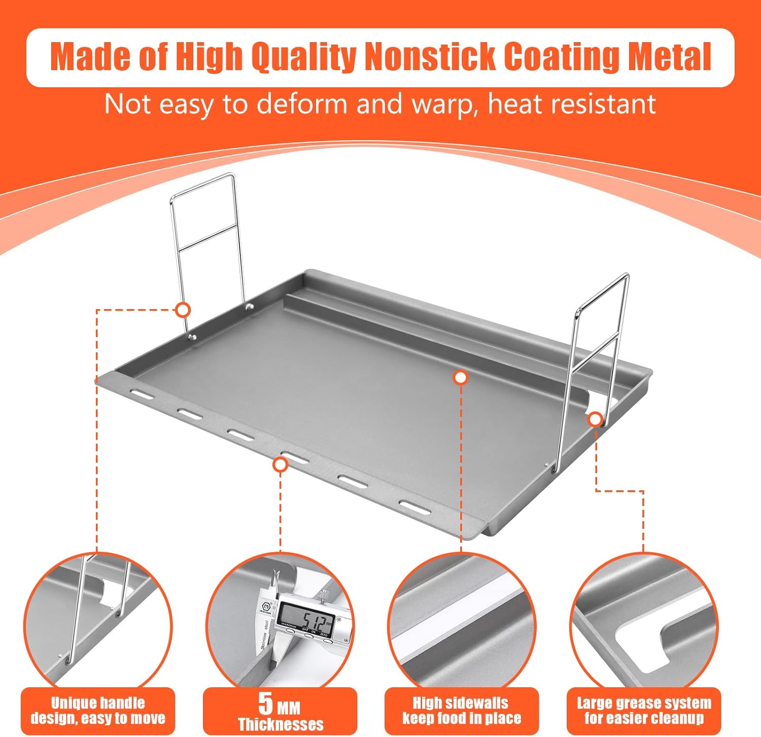 - 🔥【Upgraded Features】1. The 5mm thick material is built to last, offering excellent heat resistance and won’t easily deform. 2. Unique handle design, Easily place and remove the griddle from your grill with the unique handle for added convenience. 3. The large grease system makes cleaning grease, oil, and food residues effortless, while preventing flare-ups. 4. Side walls helpKeep food on the griddle and prevent spills or splatters for a cleaner cooking experience. 5. Smooth, polished edges to prevent scratching and ensure durability