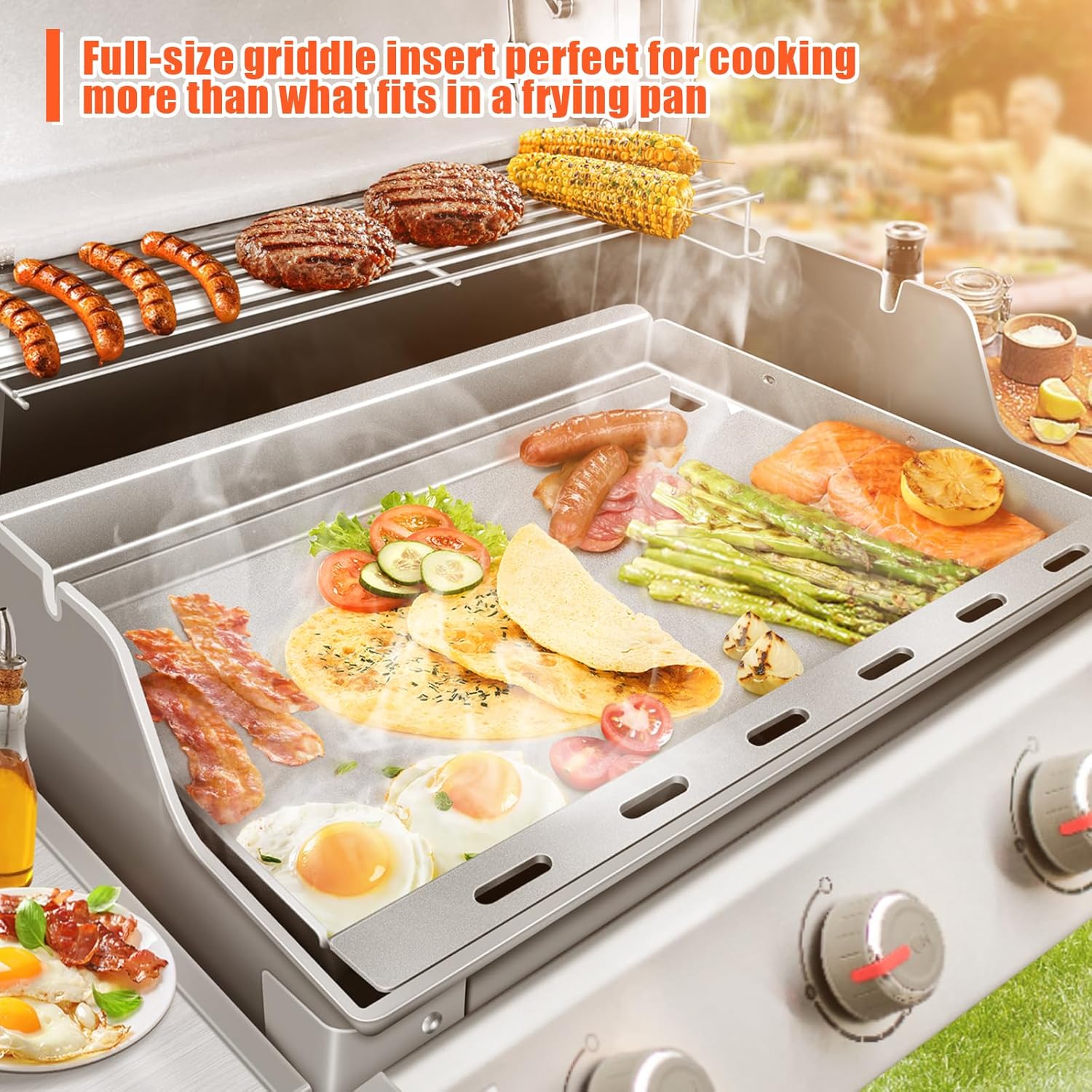 - 🔥【Seamlessly Switch From Grilling to Griddling】 – Simple to install and replace, transforming your gas grill into a professional griddle full insert in just minutes. 🔥【Versatile and Easy to Use】 – Ideal for cooking breakfast, lunch, and dinner, from eggs and pancakes to quesadillas, grilled cheese, steak, and potatoes
