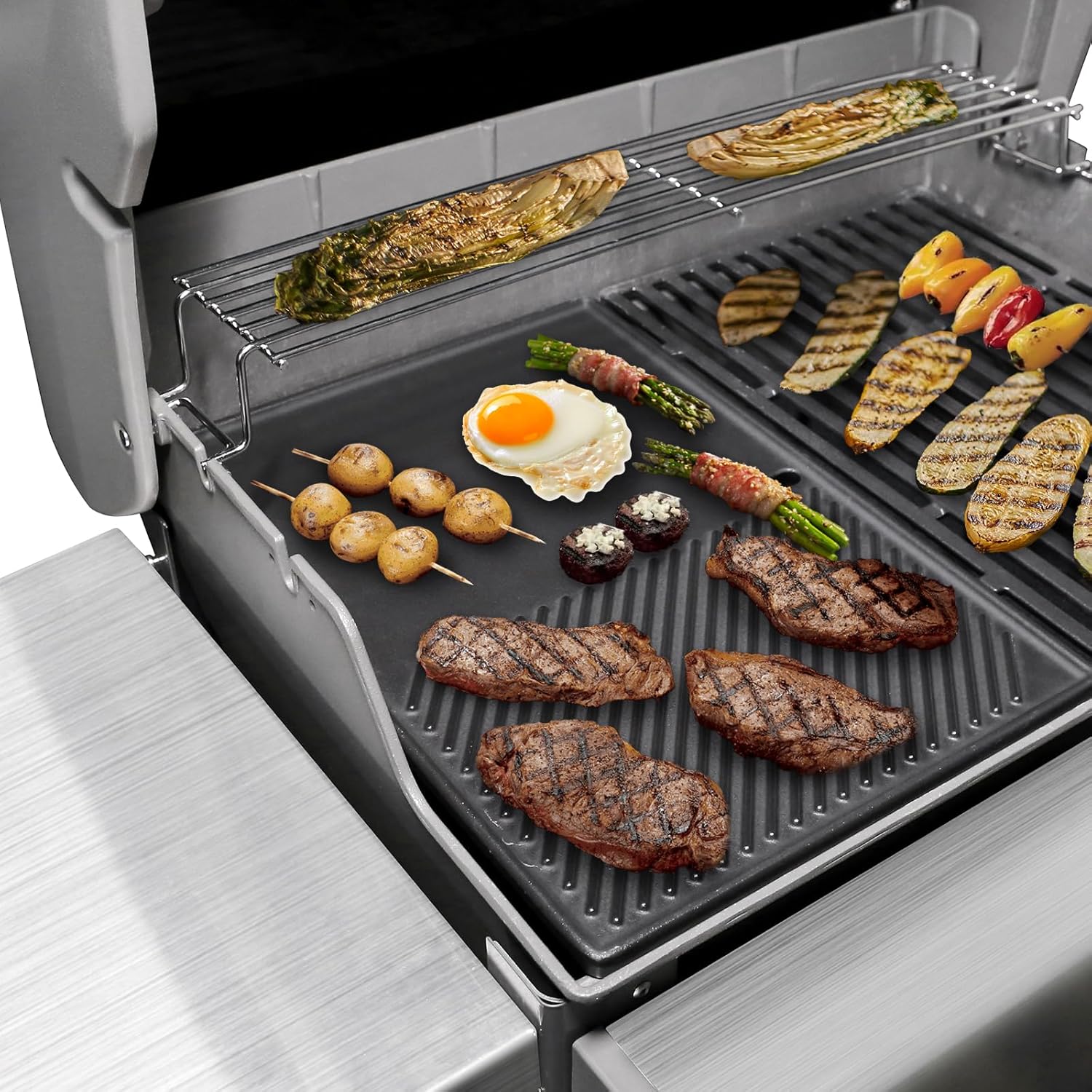 - 🔥【Distinguished Design】- The smooth side is for everything from eggs to grilled cheese panini. Flat and smooth surface is easier to clean. The ribbed side is for juicy steak, fish, hamburger, BBQ ribs or veggie kabobs. Grill marks make your food more appetizing. The hole in the griddle keeps excess oil away from food, making it a healthier cooking option. Perfect for barbecuing chicken, steak, vegetables. The hole of the griddle is also convenient for picking up and hang the griddle etc