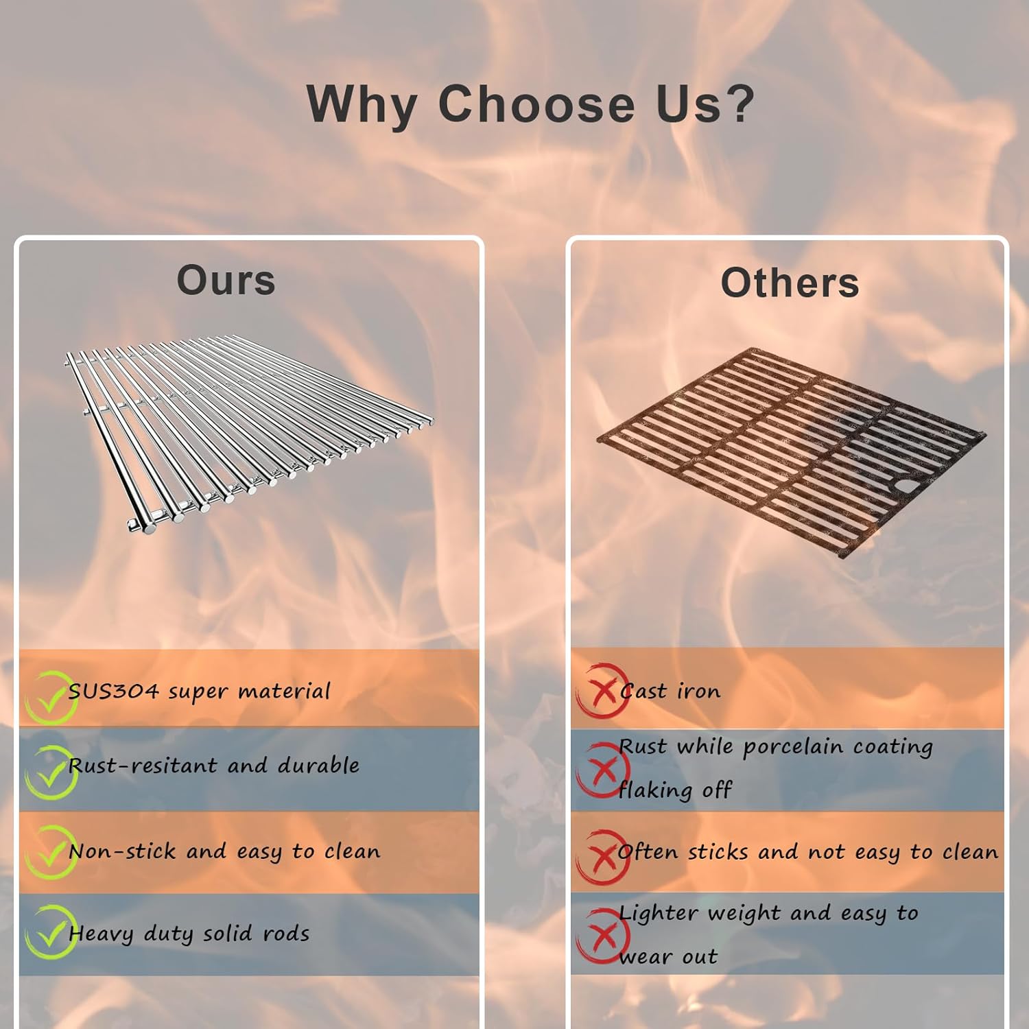 - 【Easy to Clean】Grill grate with smooth surface is free of sharp edges and the end of the rods with a round design that don't hurt your hands. Unlike the cast iron grill that requires more effort to keep clean and tidy, this stainless steel grill grate is non-stick and can be easily cleaned just with a brush.