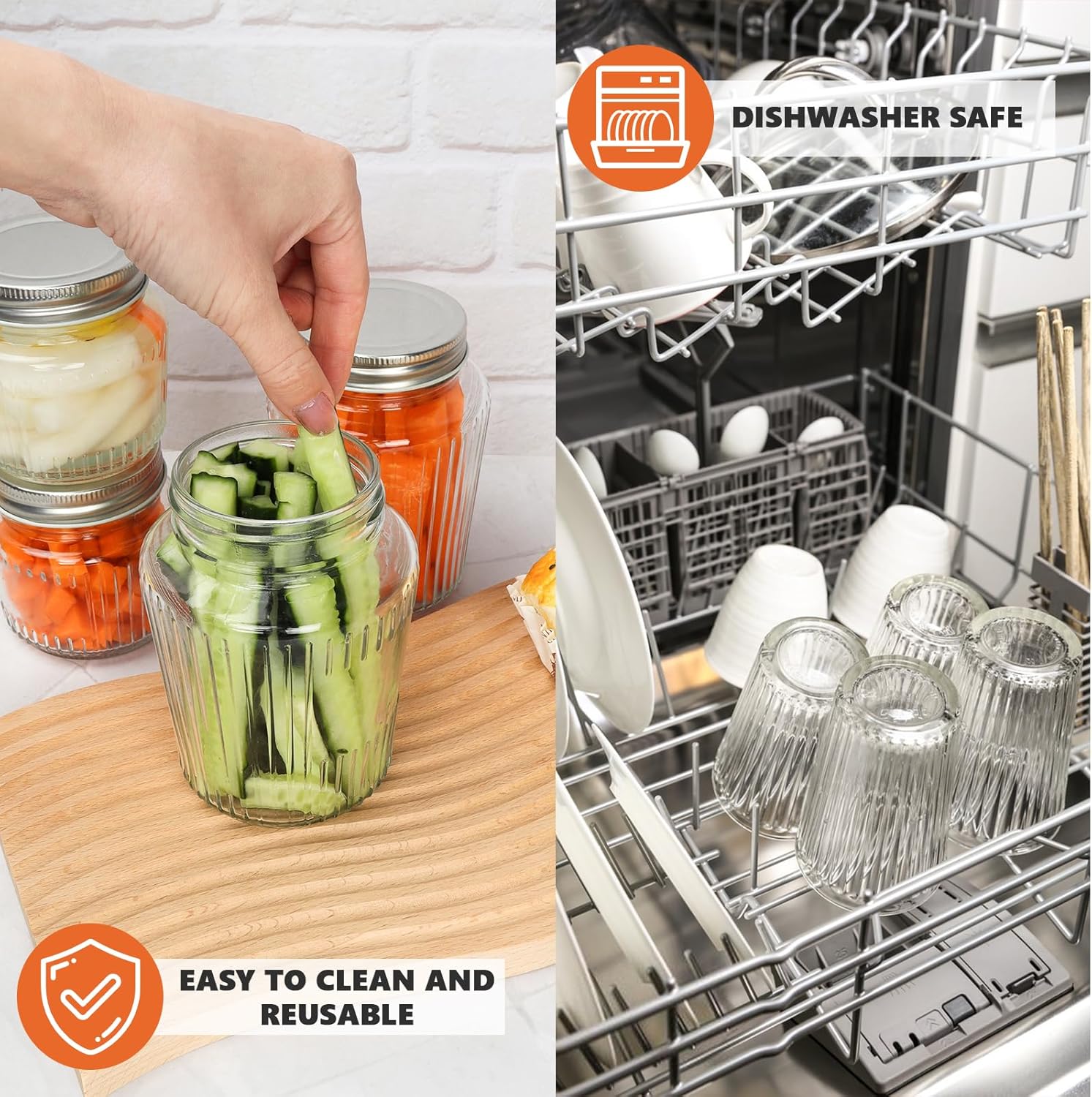 - Material: Vertically ribbed vintage styling on the exterior. Made of premium food grade glass, the canning jars are durable and sturdy enough for everyday home use