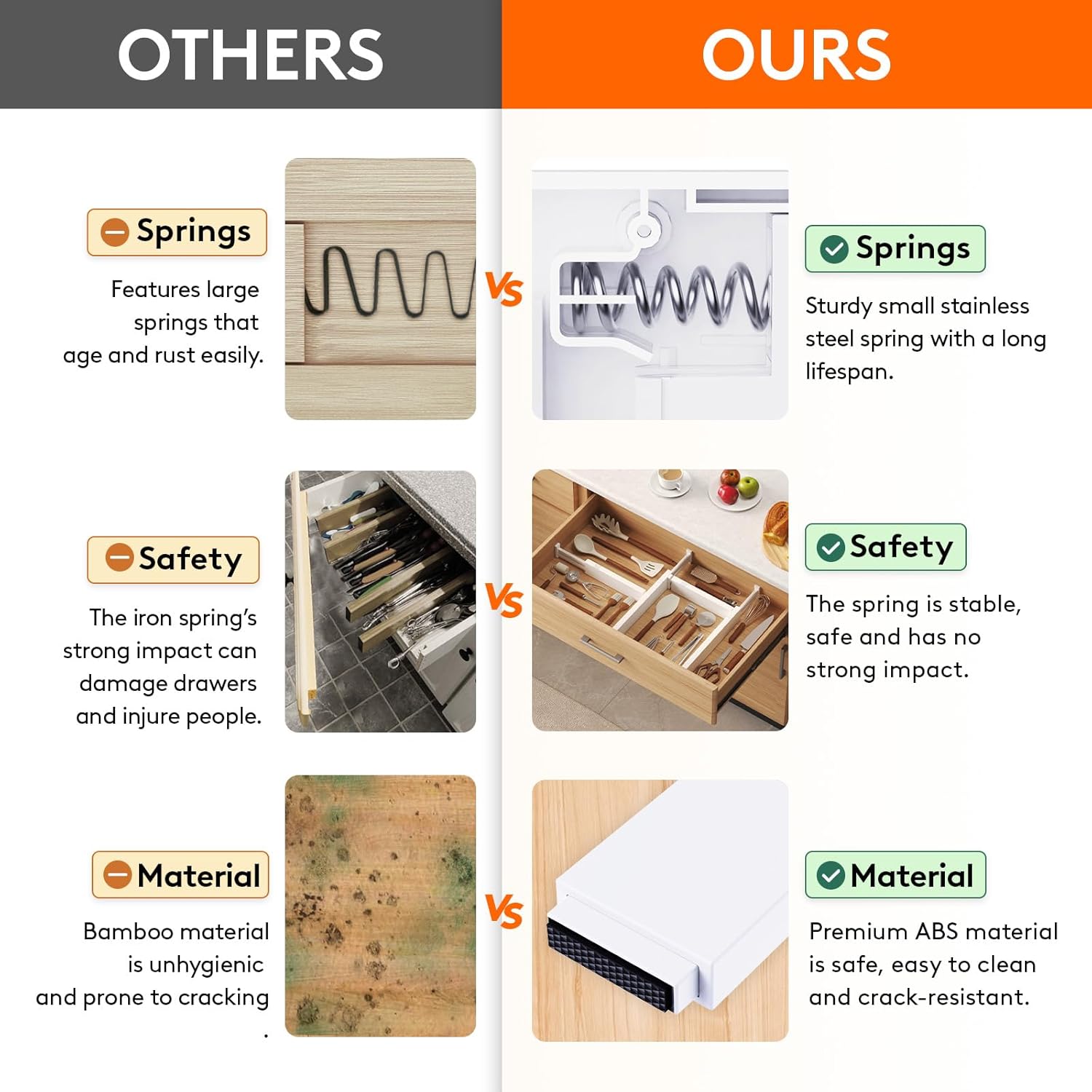 - Stable Construction: Featuring a teeth lock for powerful support and adjustability, strong springs for high elasticity and strong reinforcement, and anti-slip foams for frim grip. Our kitchen drawer organizer is patented (Patent No: US12133593B2) for a unique experience