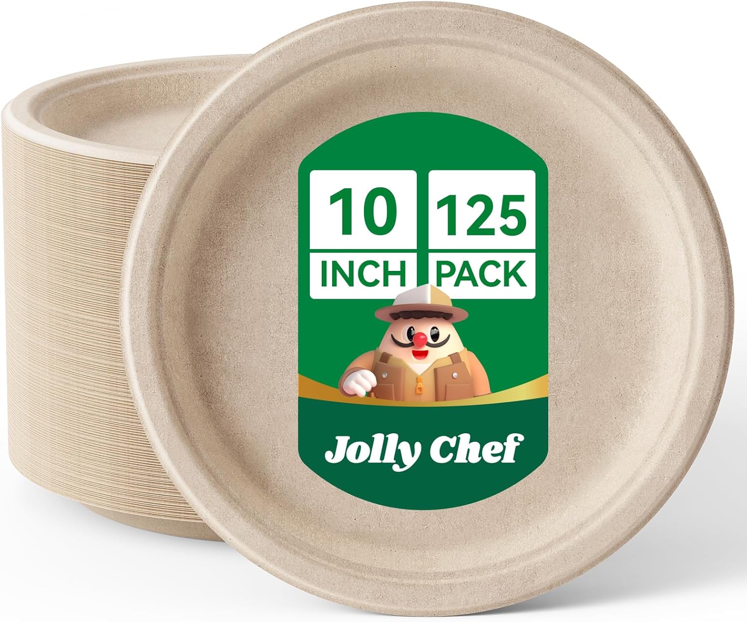 JOLLY CHEF Compostable Heavy Duty Plates ๐ญ๐ฌ ๐๐ป๐ฐ๐ต [๐ญ๐ฎ๐ฑ ๐ฃ๐ฎ๐ฐ๐ธ] Eco-Friendly Disposable Paper Plates Made of Bagasse Biodegradable Bulk for Party Dinner Sugarcane Fibers Round (Natural)