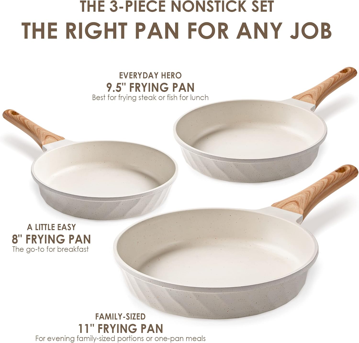 - 【3-Piece Nonstick Kitchen Pots and Pans Set】- 8 inch Frying Pan - The go-to for breakfast and easy dish / 9.5 inch Frying Pan - Perfect for frying steak, or fish for lunch / 11 inch Frying Pan - For evening family-sized portions or one-pan meals. Great nonstick cookware sets for day-to-day cooking.