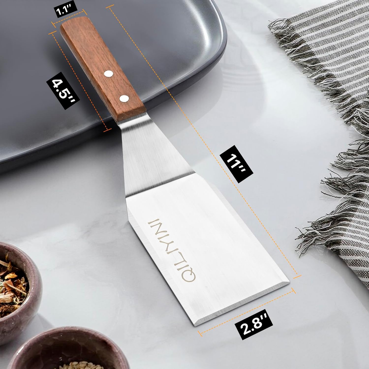 Stainless Steel Spatula Turner for Cast Iron Skillet, Grill Spatula with Wooden Handle, Heavy Duty Pancake Turner Metal