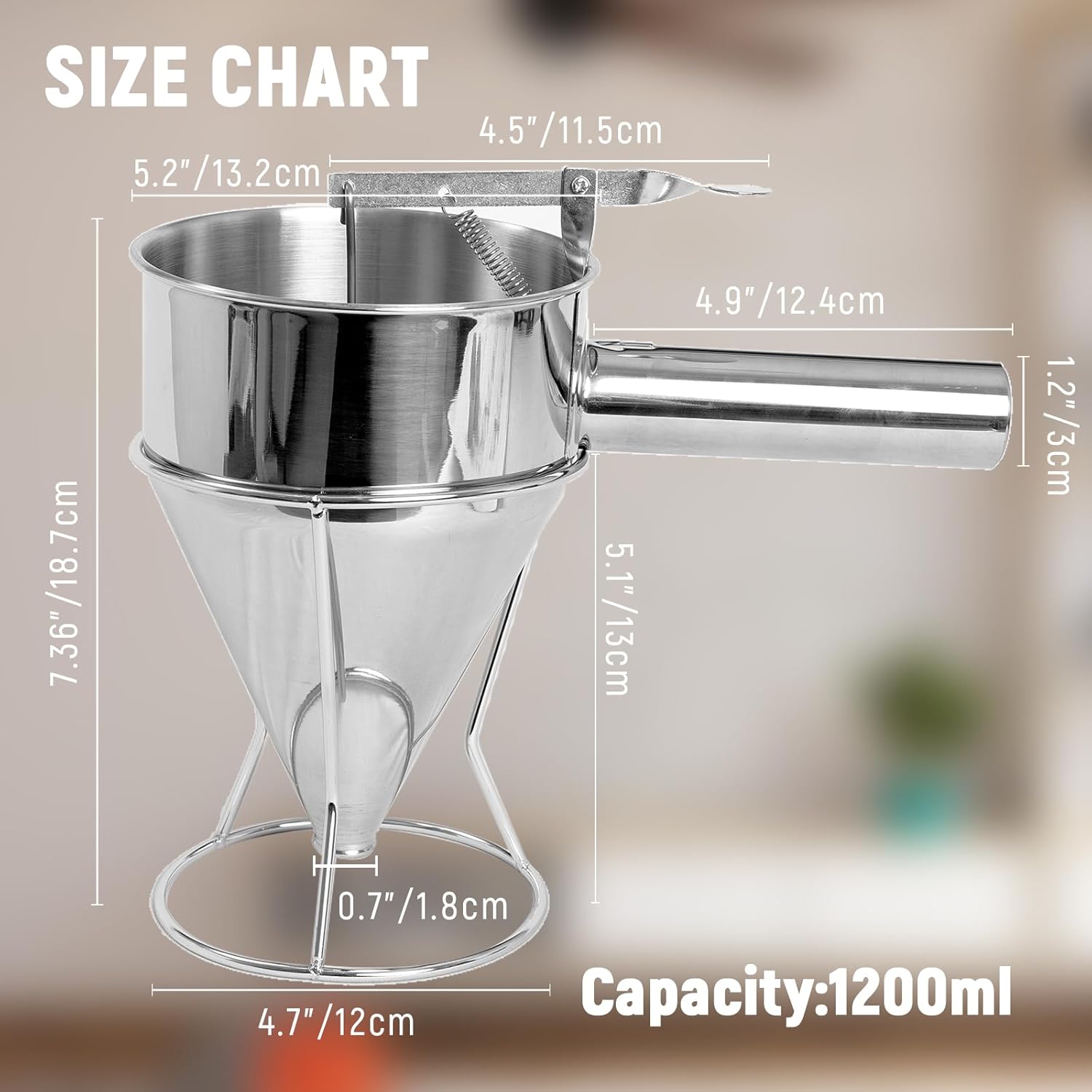 - Premium Pancake Batter Dispenser Set: Experience convenience with our stainless steel batter dispenser kit, including a dispenser with rack, grip handle, four silicone mouths (sizes: 0.31"/8mm, 0.47"/12mm, 0.55"/14mm, 0.67"/17mm). Capacity: 1200 mL.