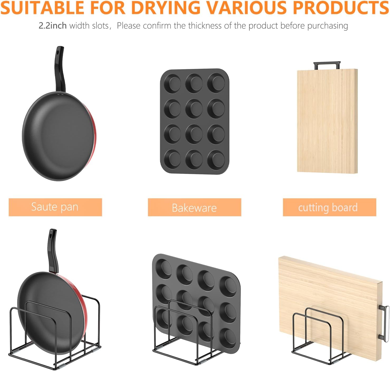 - LARGE SIZE: This bakeware rack is 8*6.5*5.5 inch, there are 3 of 2.2 inch compartments, tall and wide enough to hold three cutting boards, bakeware, or more cookie sheets.