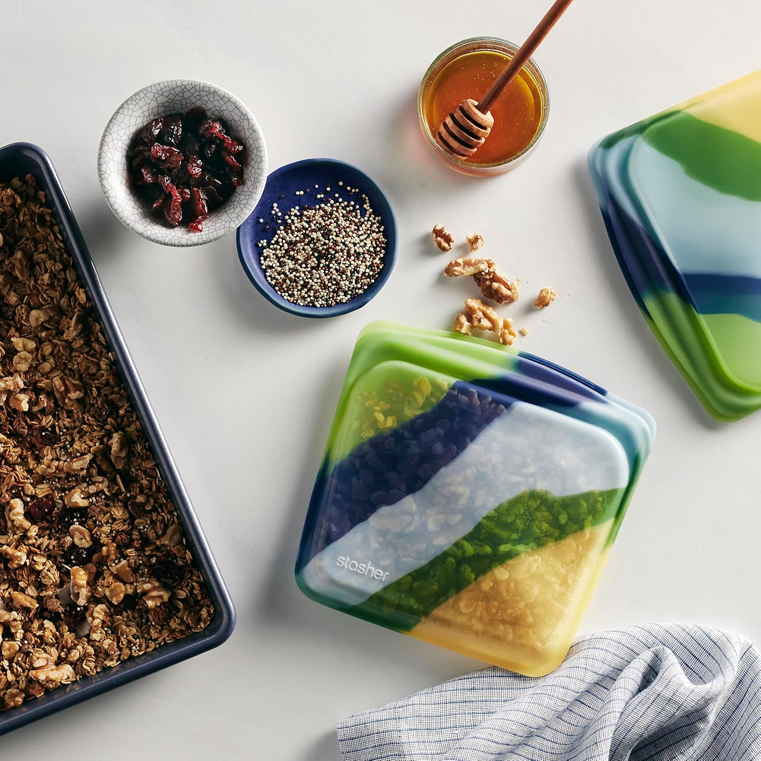 - REUSABLE, REWASHABLE CONTAINERS: Stasher silicone reusable storage bags make it easy to ditch single-use plastic and meet endless household needs. Safe for the dishwasher, microwave, oven (up to 425°F), and more.