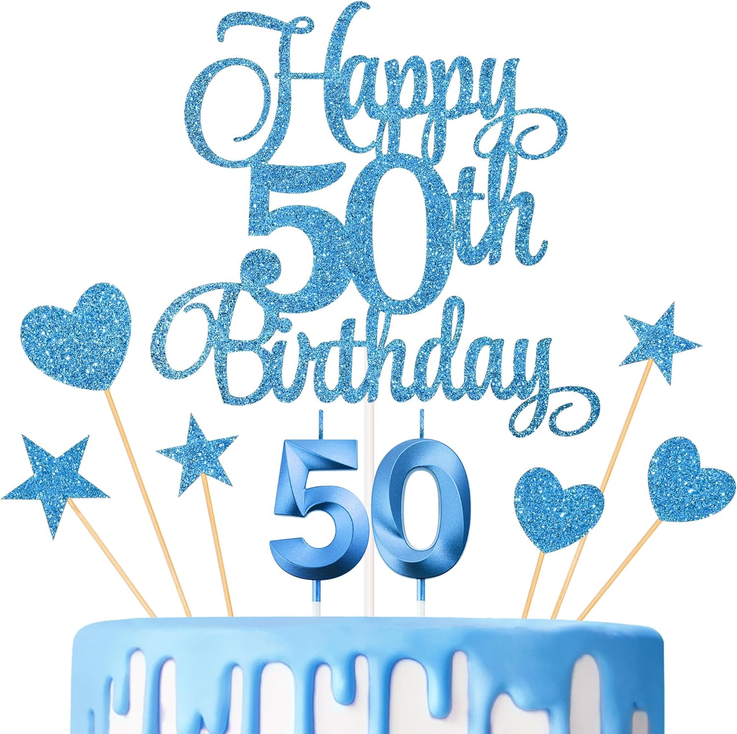 50th Birthday Cake Decorations, 50th Birthday Candles Cake Numeral Candles and Glitter Happy 50th Birthday Cake Toppers Set for Birthday Party Supplies (Blue)